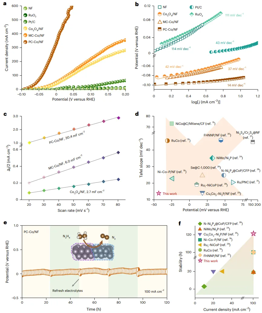 2(a) 是LSV曲线,直观对比了各催化剂的HzOR活性。PC-Co/NF表现出最佳性能,在100 mA cm⁻²的电流密度下,其电位仅为-42 mV vs. RHE,远优于MC-Co/NF(31 mV)、Pt/C(342 mV)等对照样品,表明其具有最低的过电位。2(b) 是相应的Tafel斜率图。PC-Co/NF的Tafel斜率仅为14 mV dec⁻¹,显著低于MC-Co/NF(37 mV dec⁻¹)和其他对比样品,这直接证明了PC-Co/NF在HzOR中具有最快的催化动力学,反应极易被活化。2(c) 展示了通过CV测试计算得到的双电层电容()值,用以评估电化学活性面积(ECSA)。PC-Co/NF的值(30.4 mF cm⁻²)远大于MC-Co/NF(6.0 mF cm⁻²),说明其拥有更大的活性表面积,这为其优异的催化活性提供了部分解释。2(d) 将该研究中的PC-Co/NF与文献中已报道的其他HzOR催化剂在100 mA cm⁻²下的电位和Tafel斜率进行了对比。图中清晰地显示,PC-Co/NF位于性能最优的区域,进一步凸显了其在HzOR催化中的综合优势。2(e) 展示了PC-Co/NF在100 mA cm⁻²恒定电流密度下的计时电位测试结果。该催化剂能够稳定运行120小时,且电压波动极小,显示出优异的催化稳定性。2(f) 将该研究中PC-Co/NF的稳定性与文献报道的其他HzOR催化剂进行了比较。柱状图直观地表明,PC-Co/NF的稳定性(120小时)超过了大多数已报道的催化剂,突显了其在实际应用中的潜力。