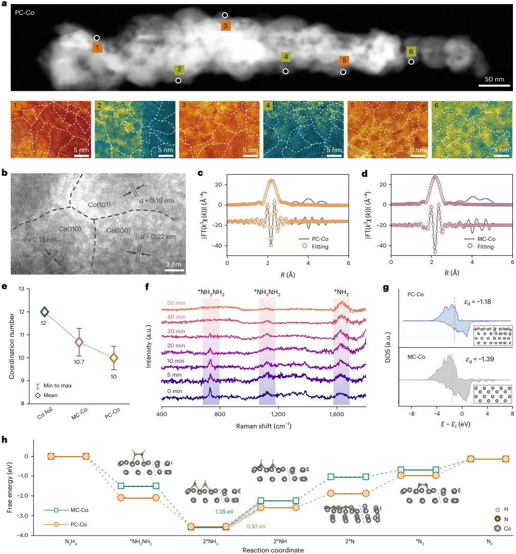 3(a) 是PC-Co的HAADF-TEM图像,显示了其均匀的多晶特征。3(b) 是高分辨TEM图像,图中不同取向的晶粒和清晰的晶界被白色虚线标出。高密度的晶界是PC-Co区别于MC-Co的关键结构特征,这种结构通常伴随着大量的低配位原子。3(c) 和 3(d) 分别是对PC-Co和MC-Co的Co K-edge EXAFS谱图进行拟合分析的结果。通过拟合第一壳层的Co-Co键,可以精确地获得Co原子的配位数。3(e) 总结了Co箔、MC-Co和PC-Co的拟合配位数(CN)。Co箔的配位数为12,MC-Co为10.7±0.6,而PC-Co的配位数最低,为10±0.5。这一结果定量地证明了PC-Co中由于存在大量晶界,其表面原子处于一个更低的配位环境中。3(f) 是在0 V vs. RHE下,PC-Co在不同反应时间点的原位拉曼光谱。随着时间推移,代表NH₂中间体的峰逐渐增强,而代表NH₂NH₂的峰逐渐减弱。这直观地验证了HzOR在PC-Co上的催化路径为,并揭示了反应中间体的动态演化过程。3(g) 是通过DFT计算得到的Co原子d带态密度(DOS)。PC-Co的d带中心(-1.18 eV)明显高于MC-Co(-1.39 eV),更靠近费米能级。这意味着PC-Co对反应物/中间体的吸附能力更强,有利于催化反应的启动。3(h) 是HzOR在不同催化剂表面的自由能图。计算表明,速率决定步骤均为*NH₂→ *NH。PC-Co的能垒(0.97 eV)远低于MC-Co(1.35 eV),这直接解释了PC-Co具有更快催化动力学的原因。插图展示了中间体在PC-Co表面的最稳定吸附构型,为理论计算提供了直观的模型。