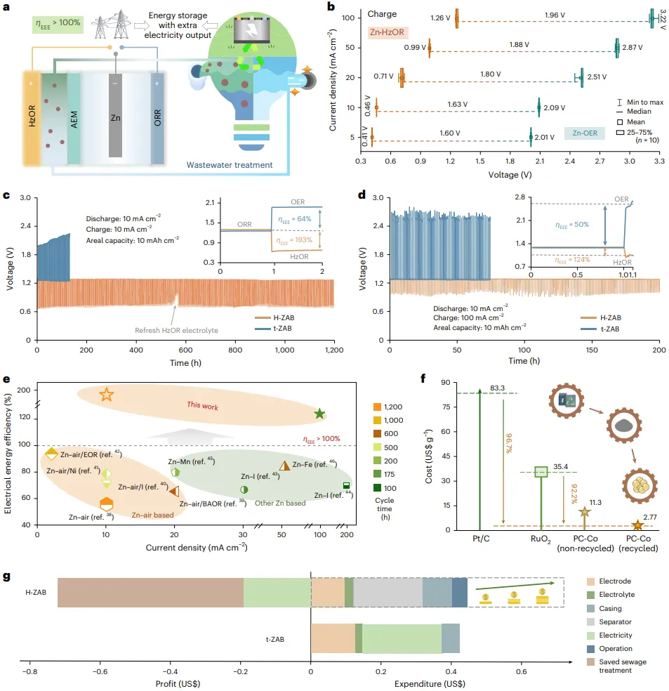 4(a) 是H-ZAB的结构示意图。电池将充电过程中的传统氧析出反应(OER)替换为肼氧化反应(HzOR),放电过程仍为锌氧化和氧还原反应(ORR)。这种设计使得充电电压显著降低,同时还能处理含肼废水,实现“变废为宝”。4(b) 对比了不同电流密度下,锌-肼(Zn-HzOR)和锌-氧(Zn-OER)两种电极组合的充电电压。在所有电流密度下,Zn-HzOR的充电电压都远低于Zn-OER,尤其是在高电流密度(如100 mA cm⁻²)下,其优势更为突出,显示出H-ZAB具有快速充电的巨大潜力。4(c) 比较了传统ZAB(t-ZAB)和H-ZAB在10 mA cm⁻²下的长期循环稳定性。H-ZAB的能量效率()高达193%,而t-ZAB仅为64%,并且H-ZAB能够稳定运行超过1200小时,远超t-ZAB。插图展示了首圈充放电曲线,直观对比了两者的电压平台和能量效率差异。4(d) 评估了电池在“慢放快充”模式下的性能(放电10 mA cm⁻²,充电100 mA cm⁻²)。即使在如此苛刻的快速充电条件下,H-ZAB仍能保持124%的高能量效率,而t-ZAB的效率已降至50%。这进一步证明了H-ZAB在快充应用场景下的巨大优势。4(e) 将该研究中的H-ZAB性能与文献中已报道的其他先进电池体系(包括Zn-空气、Zn-碘、Zn-锰等)进行了对比。图中的数据点显示,该工作的H-ZAB在能量效率和循环时间方面均处于领先地位。4(f) 展示了不同HzOR催化剂的成本核算。通过从废旧锂离子电池(LIBs)中回收Co元素,制备的再生PC-Co成本仅为2.77 US$ g⁻¹,远低于未使用回收原料的PC-Co(11.3 US$ g⁻¹)以及商业Pt/C和RuO₂。这体现了该研究在资源循环利用和降低成本方面的显著优势。4(g) 是对t-ZAB和H-ZAB整个生命周期进行的技术经济分析(TEA)。尽管H-ZAB因使用额外的隔膜和电解质等增加了部分初期投资,但由于其超高的能量效率(发电收益)和废水处理的节约,最终在整个生命周期内实现了净盈利,投资回报率高达61.8%;而t-ZAB则处于亏损状态。这从经济学角度有力证明了H-ZAB系统的可行性和巨大经济价值。