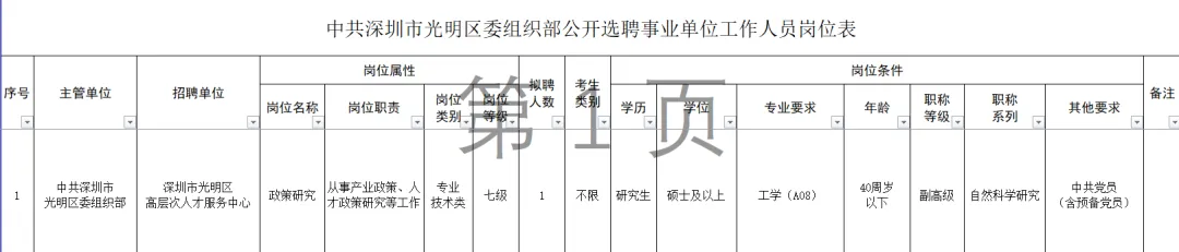 选聘深圳市光明区高层次人才服务中心专业技术七级岗位工作人员1名,具体岗位详见《中共深圳市光明区委组织部公开选聘事业单位工作人员岗位表》(附件1,以下简称《岗位表》)。