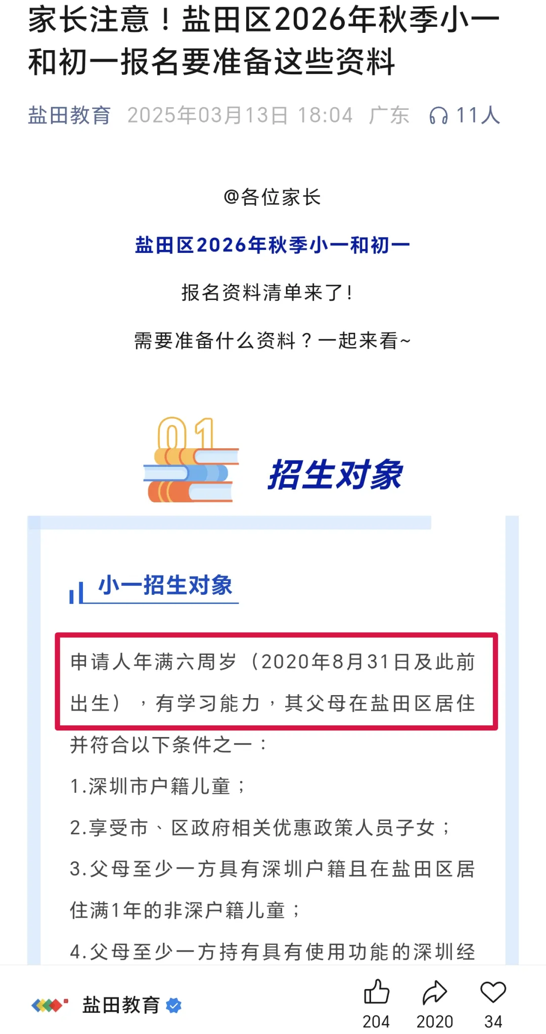 申请人年满六周岁(2020年8月31日及此前出生),有学习能力,其父母在盐田区居住并符合以下条件之一: