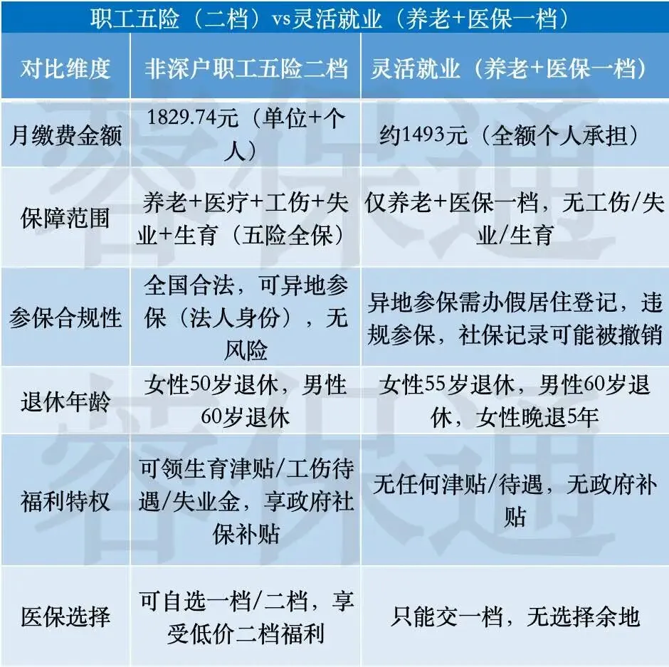 灵活就业无优势:灵活就业仅能交养老+医保一档,月缴约1493元(养老20%+医保8%),无工伤/失业/生育保障,且缴费比非深户二档五险仅少337元,保障差一大截!