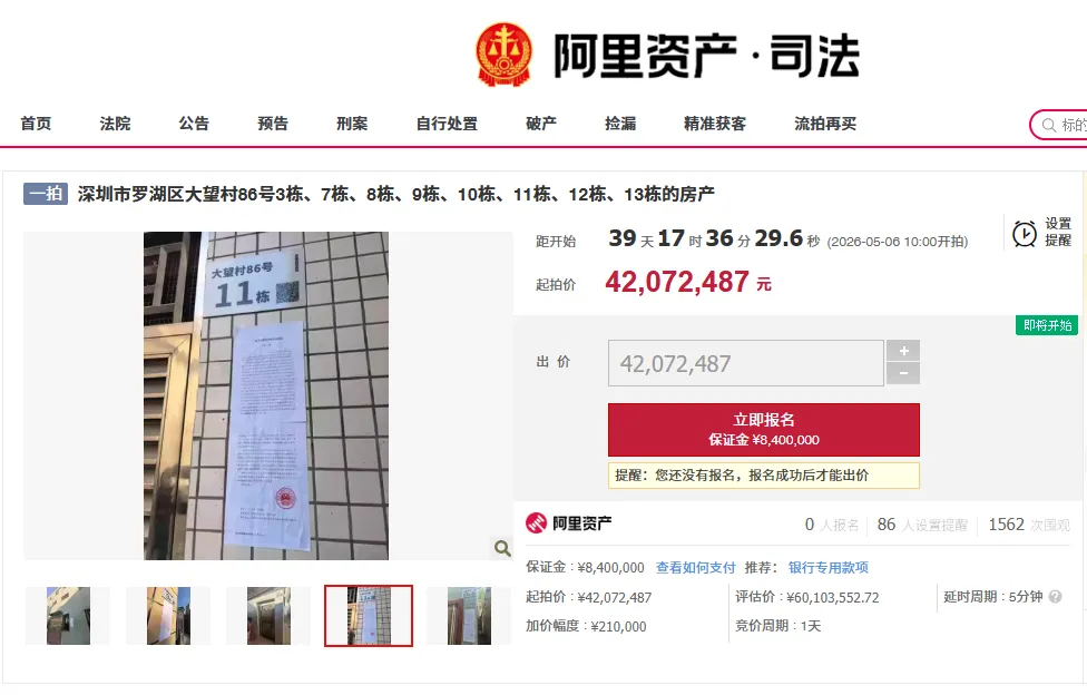 近日,深圳市罗湖区大望村86号3栋、7栋、8栋、9栋、10栋、11栋、12栋、13栋的房产进行一拍,标的物用地面积约1万㎡,总建面约0.5万㎡,起拍价4207万元,起拍综合楼面价约0.82万元/㎡,2026年5月6日起拍。