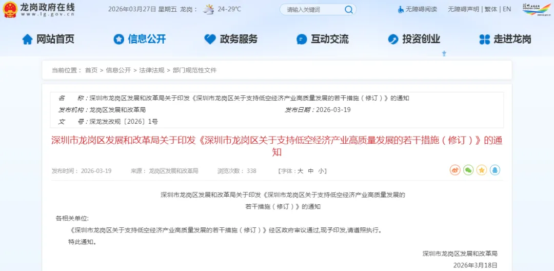 (十四)本措施自2026年4月1日起施行,有效期3年。原《龙岗区关于促进低空经济产业发展的若干措施》(深龙工信规〔2023〕14号)同时废止。在有效期内,深圳市龙岗区发展和改革局可根据实际情况,对本若干措施进行整体性修订、调整、发布和实施。