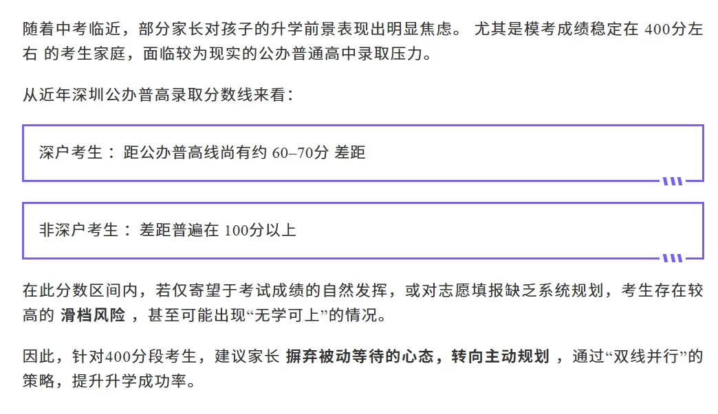 >深圳初三400分左右考生注意!可捡漏公办高中的升学路径解读!中考!深户差70分,非深户差100分!这样理性规划可以避免滑档!