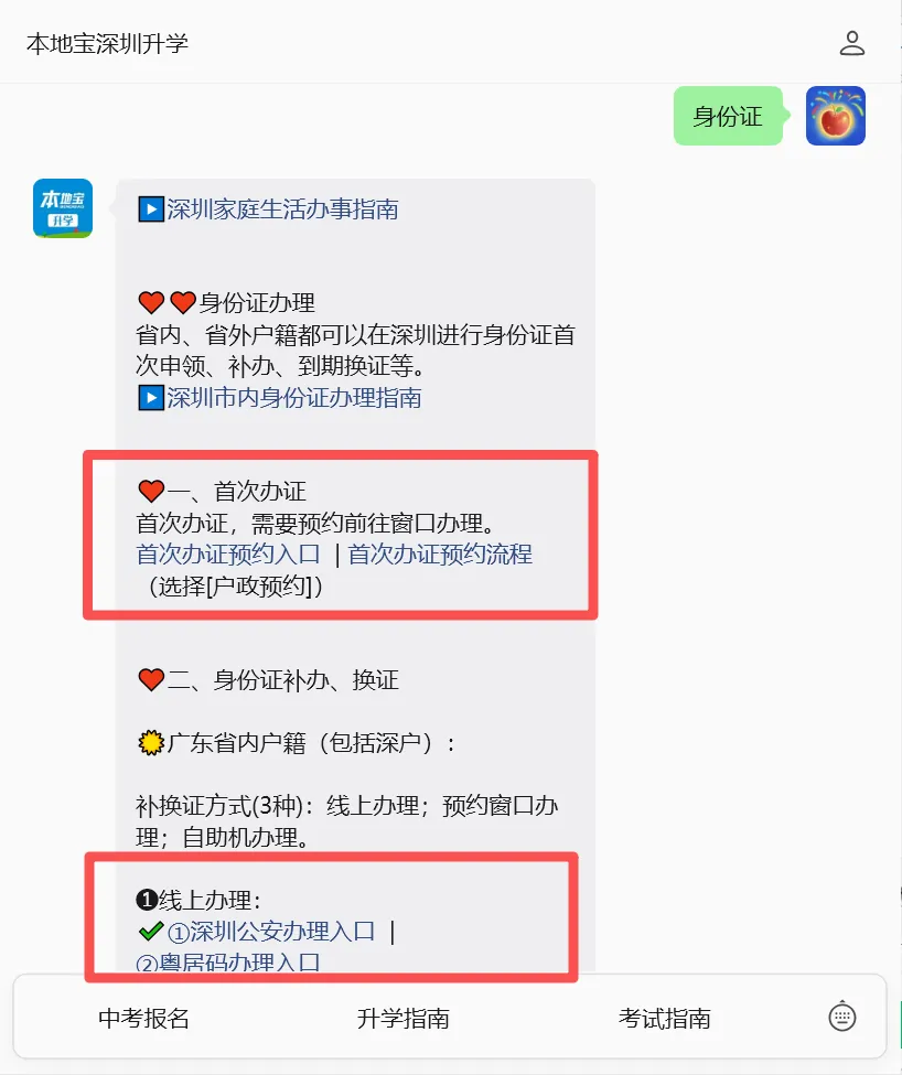 可在“深圳公安”公众号预约,也可长按下方二维码,进入【本地宝深圳升学】回复【身份证】获取儿童身份证办理入口、办理材料+流程、办理窗口、政策要求