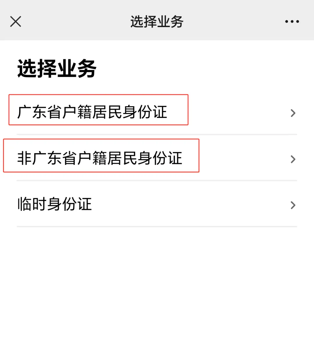然后我们点击“居民身份证”,看到两个入口,广东省家庭请点击广东省户籍居民身份证,外省家庭请点击非广东省户籍居民身份证,详见下图