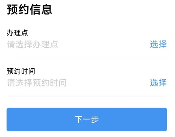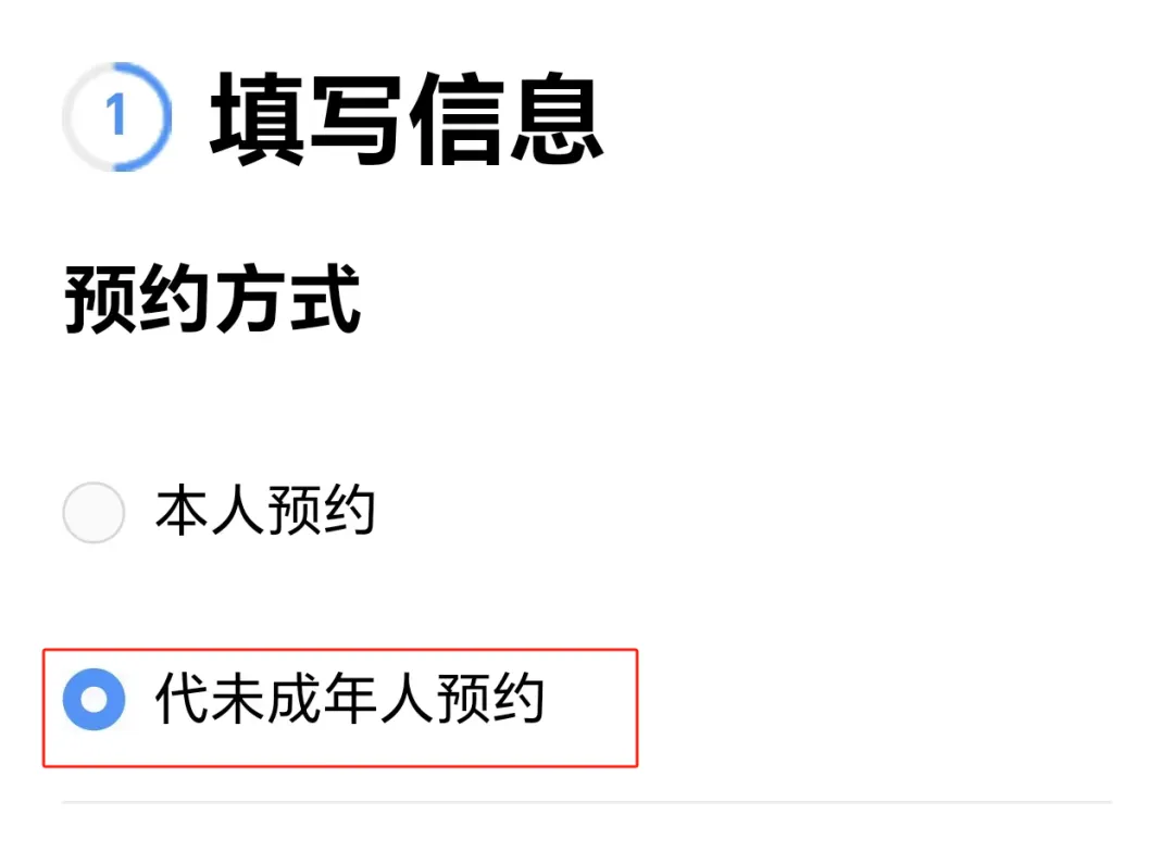 勾选代未成年人预约,在预约人信息的地方填写家长信息,在申请人信息的地方填写儿童信息,选择办理点和预约时间,然后点下一步