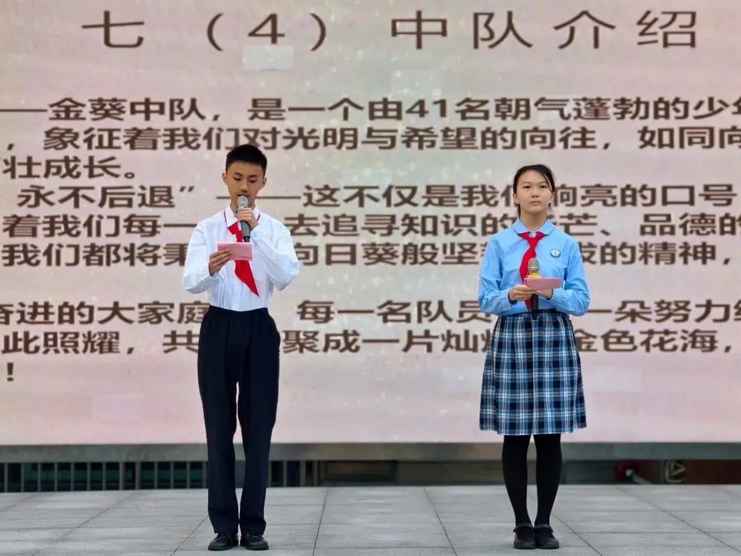 七(4)中队全体队员为全校师生带来了一场题为《世界在我眼前》的深情朗诵,队员们以朗诵为载体,用清脆、活泼、坚定的声音,描绘出世界斑斓的色彩、丰富的味道与多元的声音,传递出对世界的好奇与向往。