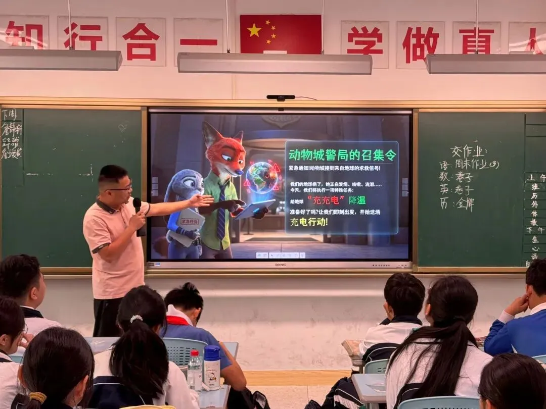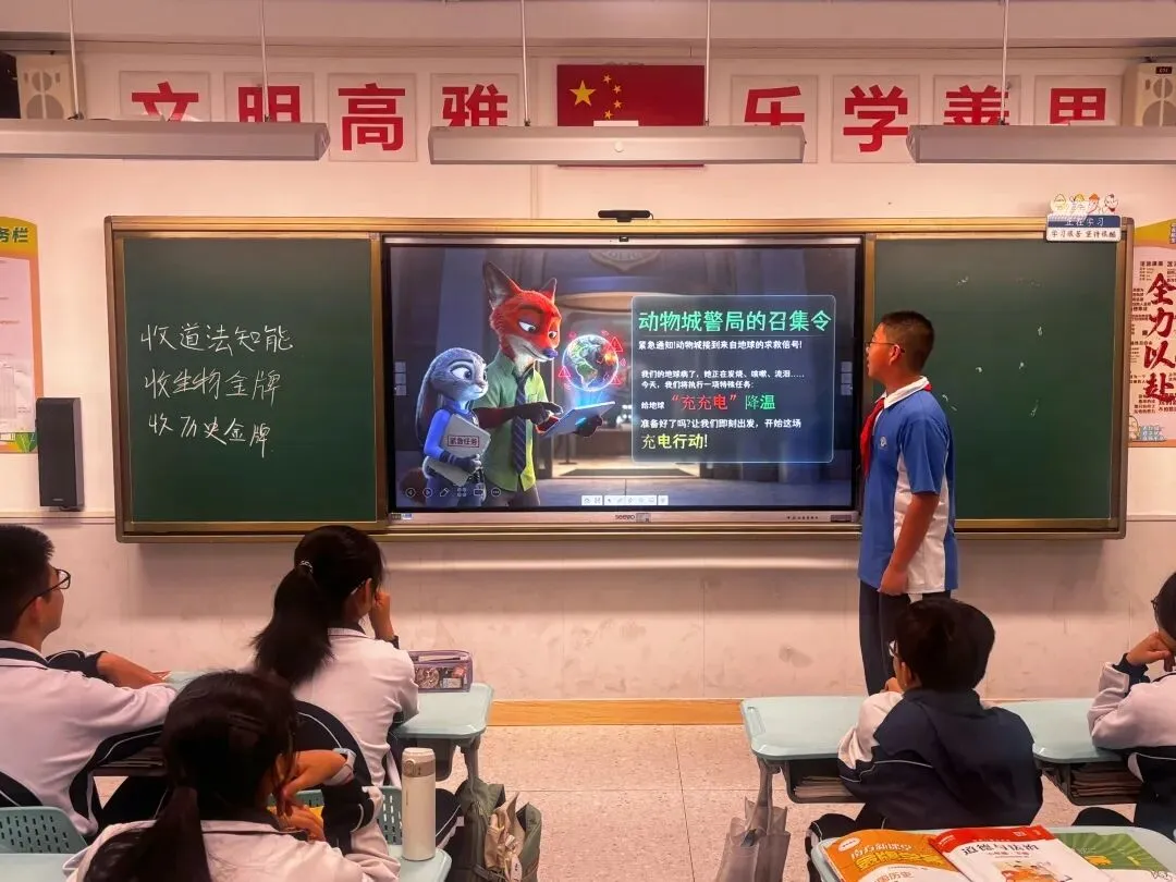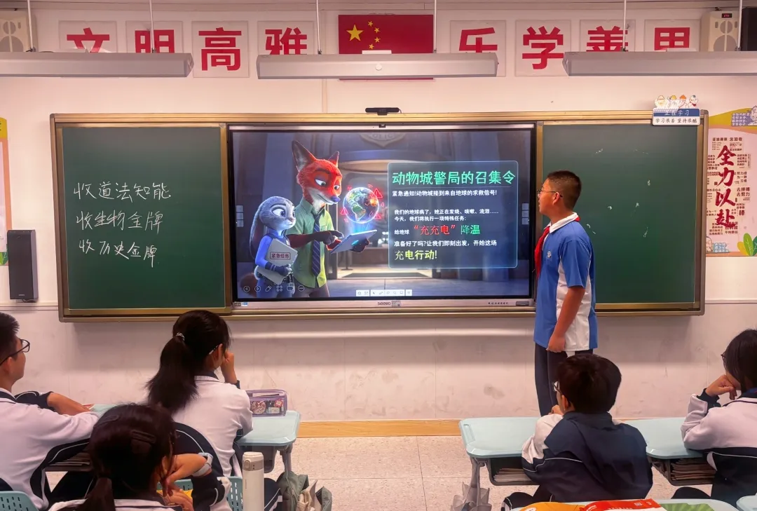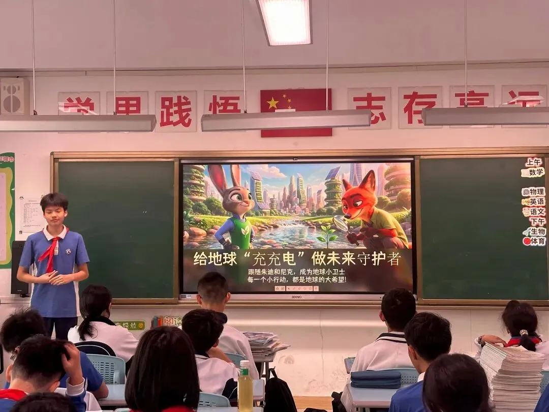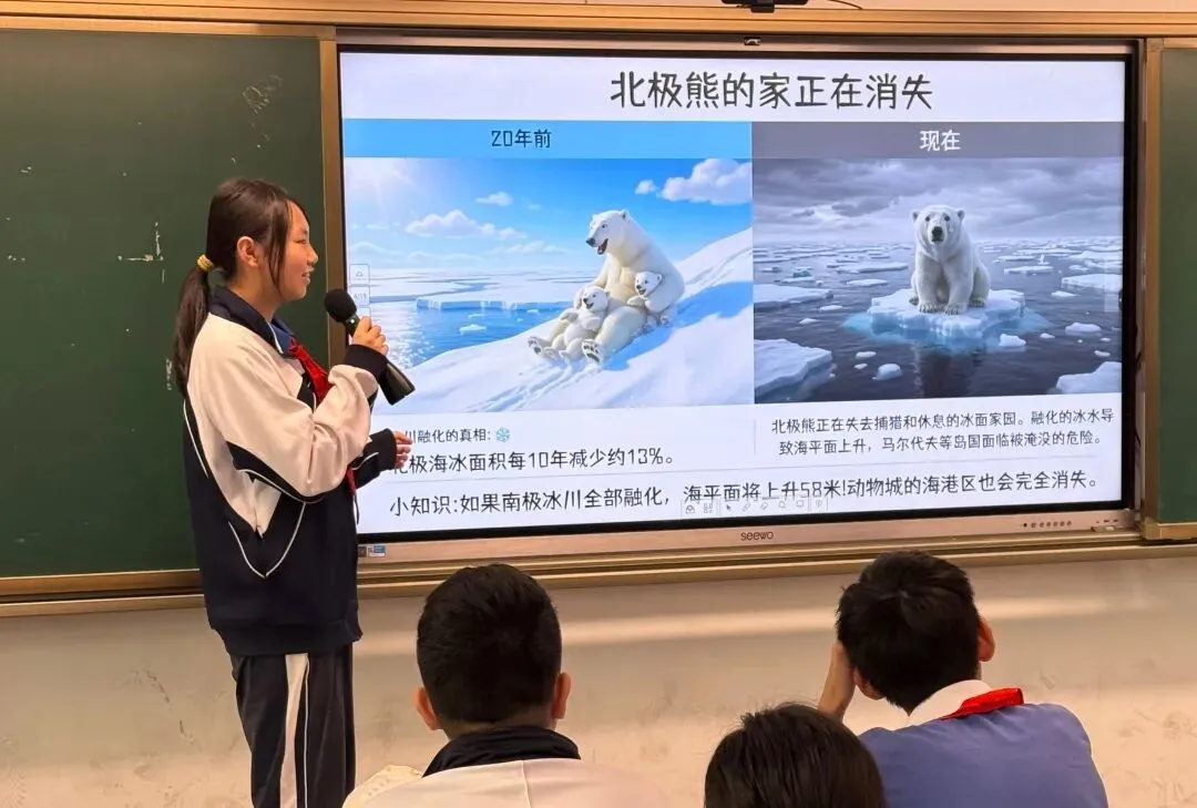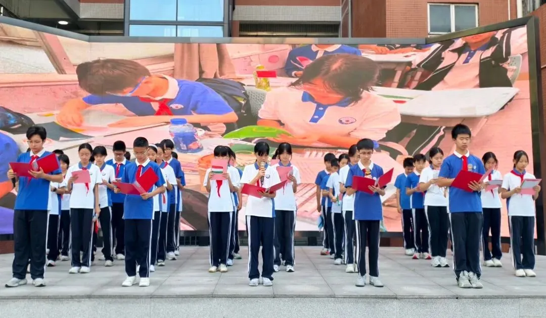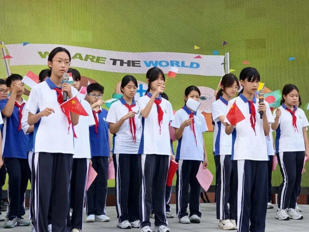 朗诵环节结束后,七(4)中队的曾睿晞、陈姿亦动情演唱We Are the World,悠扬的旋律里,同学们挥舞着旗帜,传递着对多元文化的尊重,更以行动诠释着“天下大同”的美好期许。