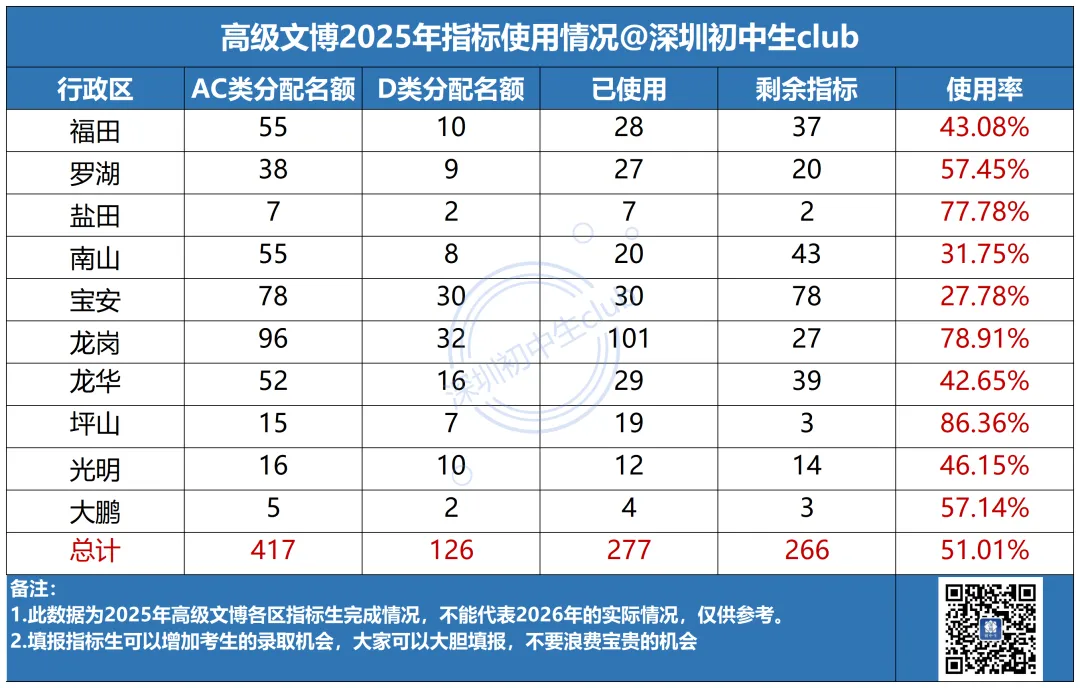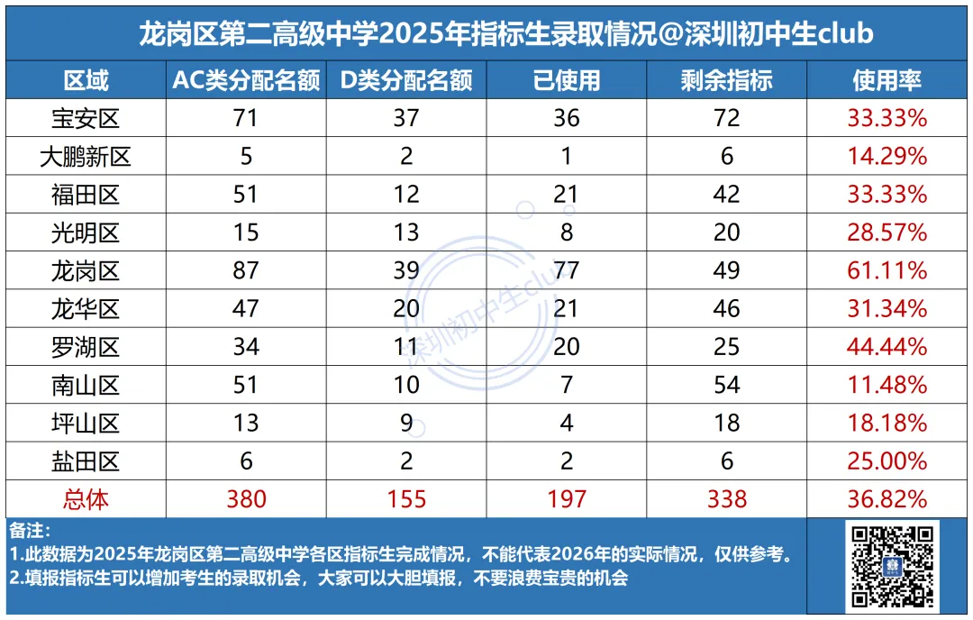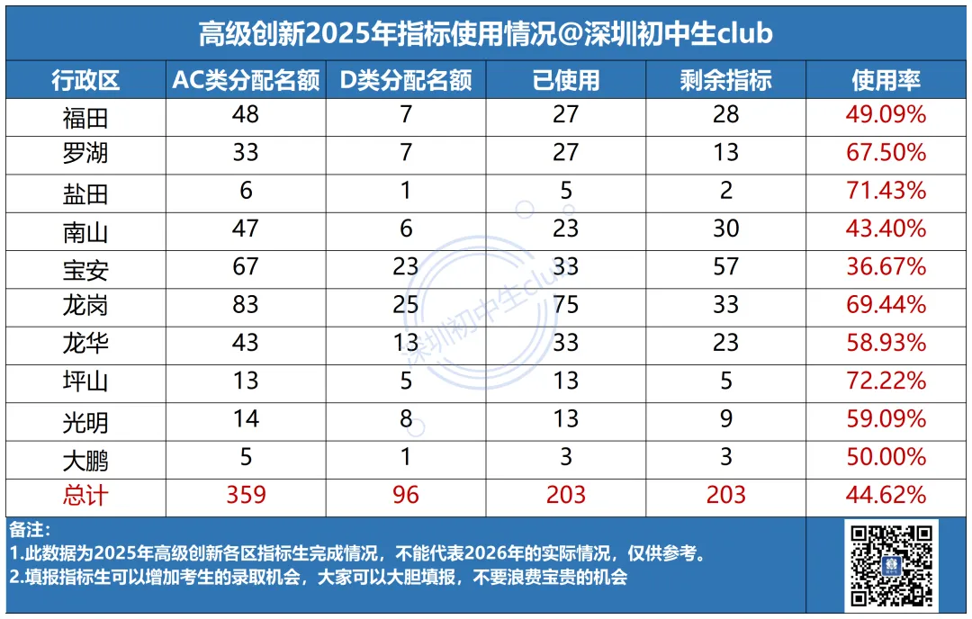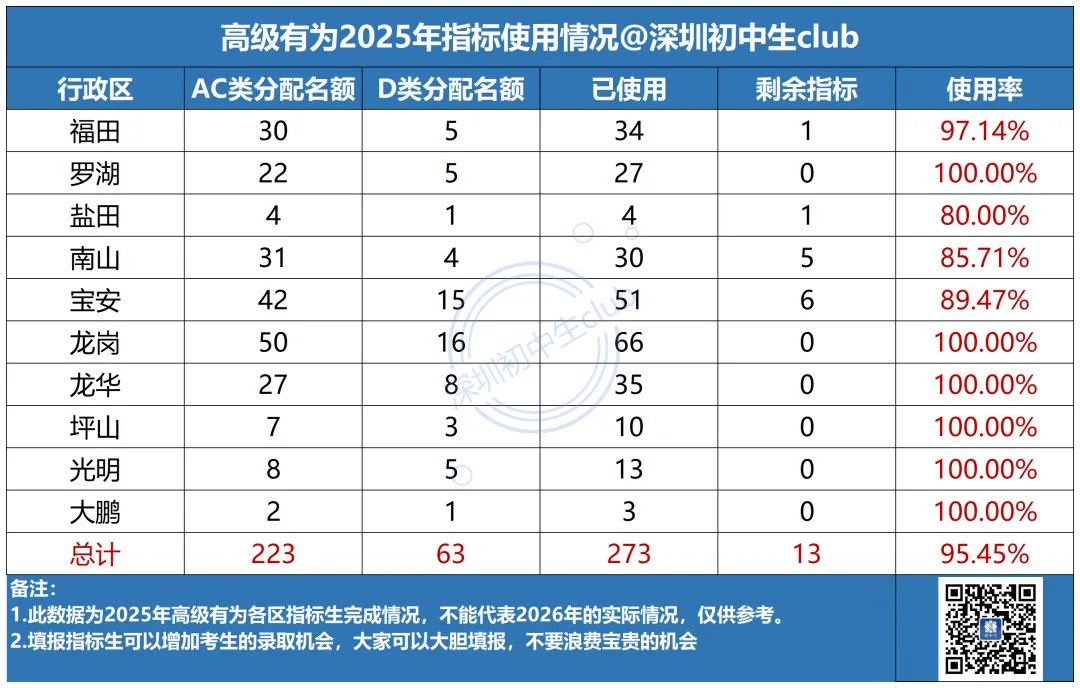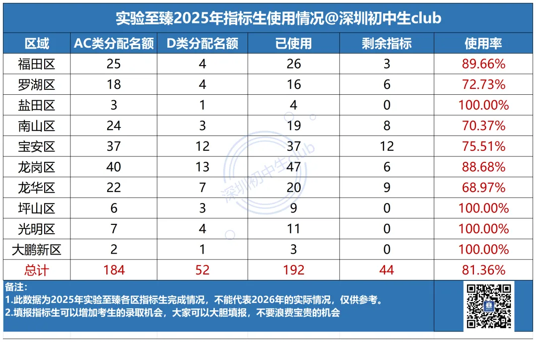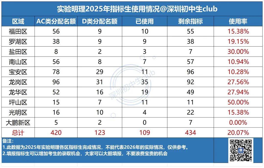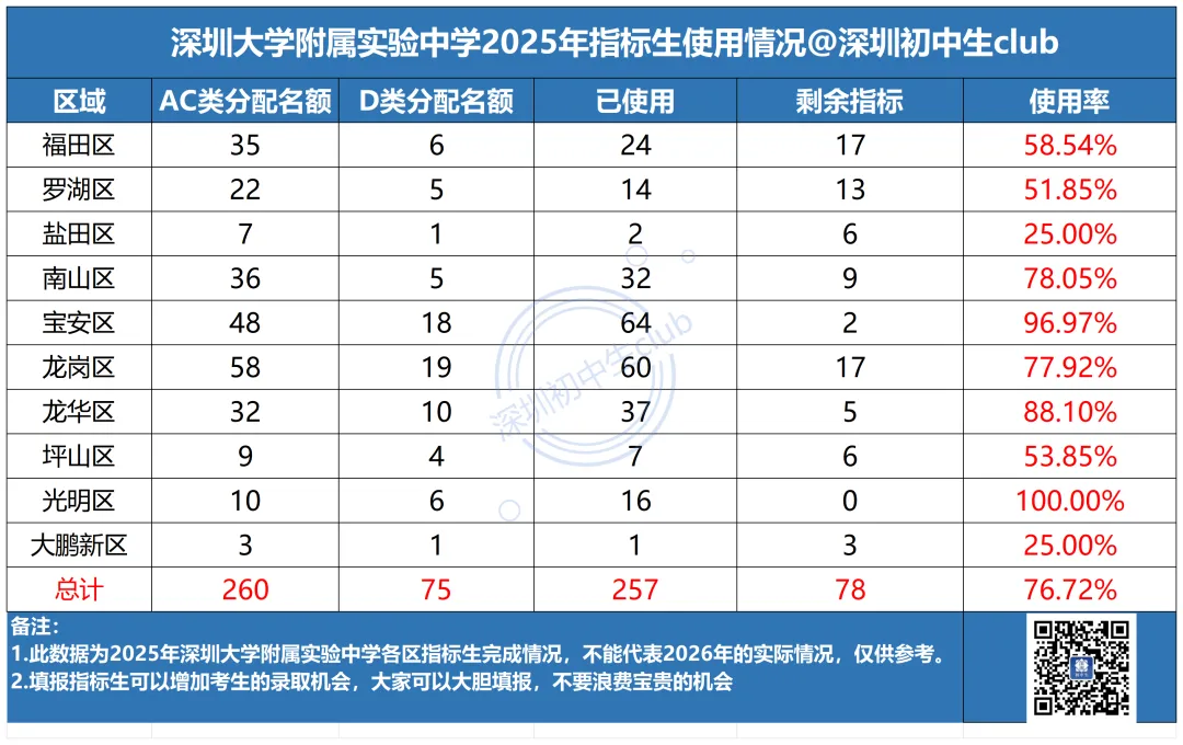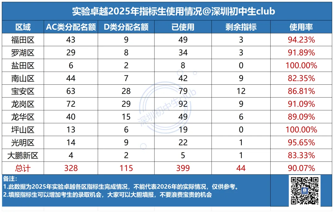 截止目前深大实验、二高深汕、深高级高中园、深实验高中园、光明中学等15所高中各区AC类、D类名额分配(“原指标生”)录取完成率已有数据。