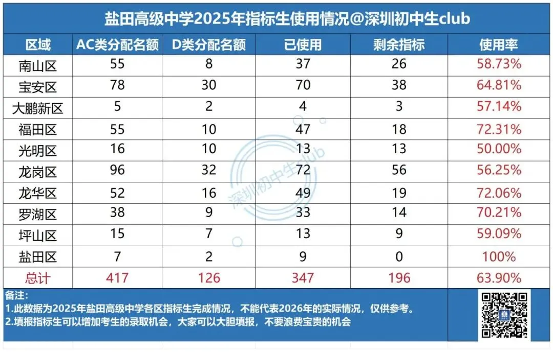 盐田高级中学2025年指标生全市范围内AC类分配名额共417个,D类126个;实际录取347个,剩余196个未使用,整体使用率为63.90%。