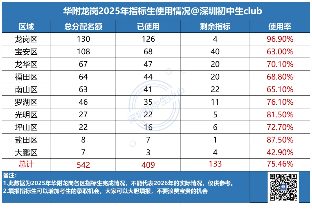 华附龙岗2025年指标生总分配数为542个,实际录取数为409个,总体使用率 75.46%。