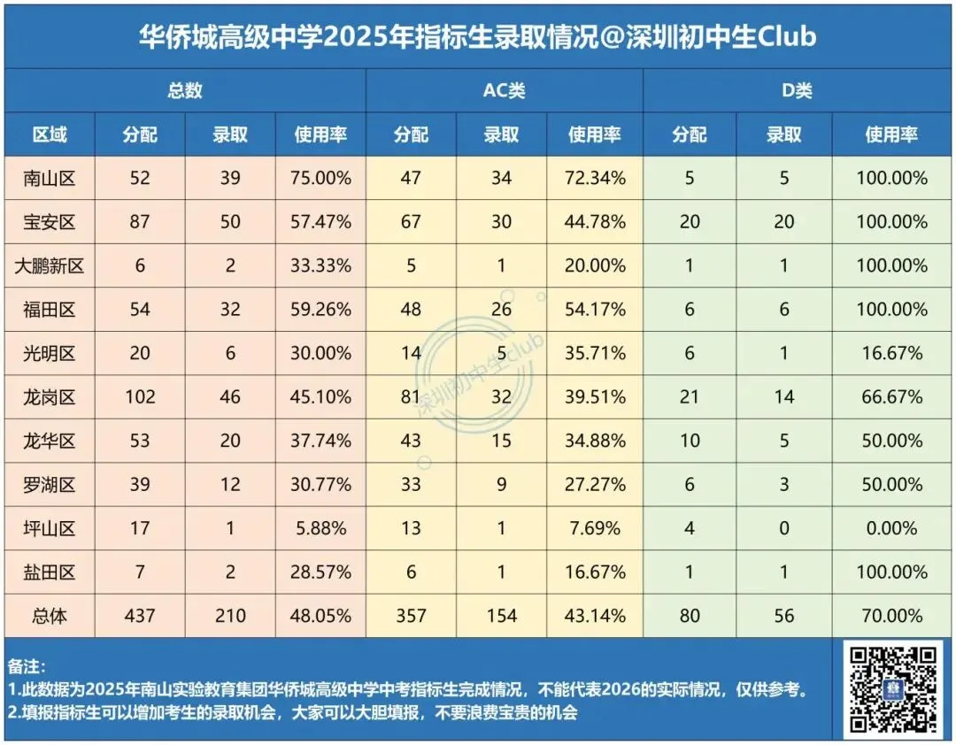 华侨城高级2025年指标生总分配数为437个,实际录取数为210个,总体使用率 48.05%。其中AC类指标生分配357个,录取154个,使用率43.14%;D类指标生分配80个,录取56个,使用率70.00%。