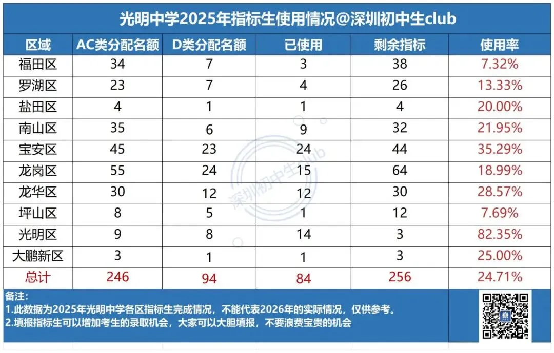 光明中学2025年指标生分配总数为340个,总体使用率为24.71%。