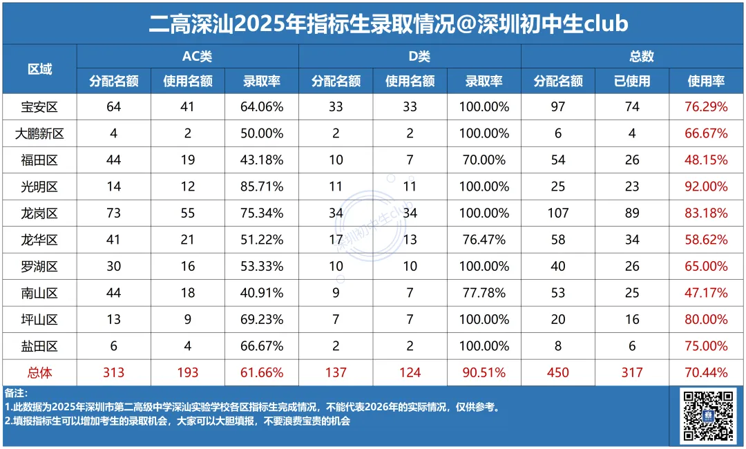 二高深汕2025年指标生分配总数为450个,总体使用率为70.44%;其中AC类使用率61.66%,D类使用率90.51%。