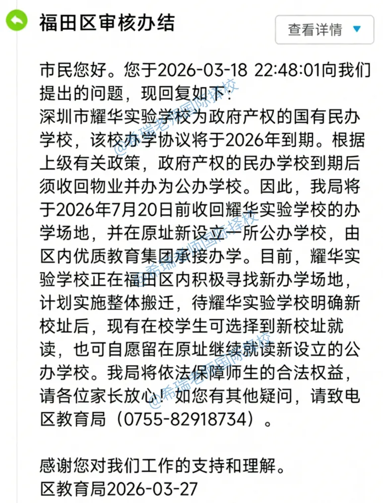 今天上午,业内确认:深圳福田耀华实验学校将转为公立学校。
