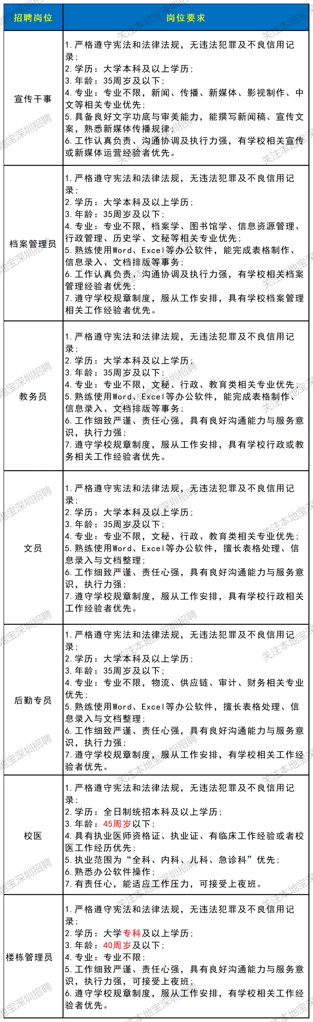 招聘宣传干事,档案管理员,教务员,文员,后勤专员,校医,楼栋管理员。具体要求如下图所示