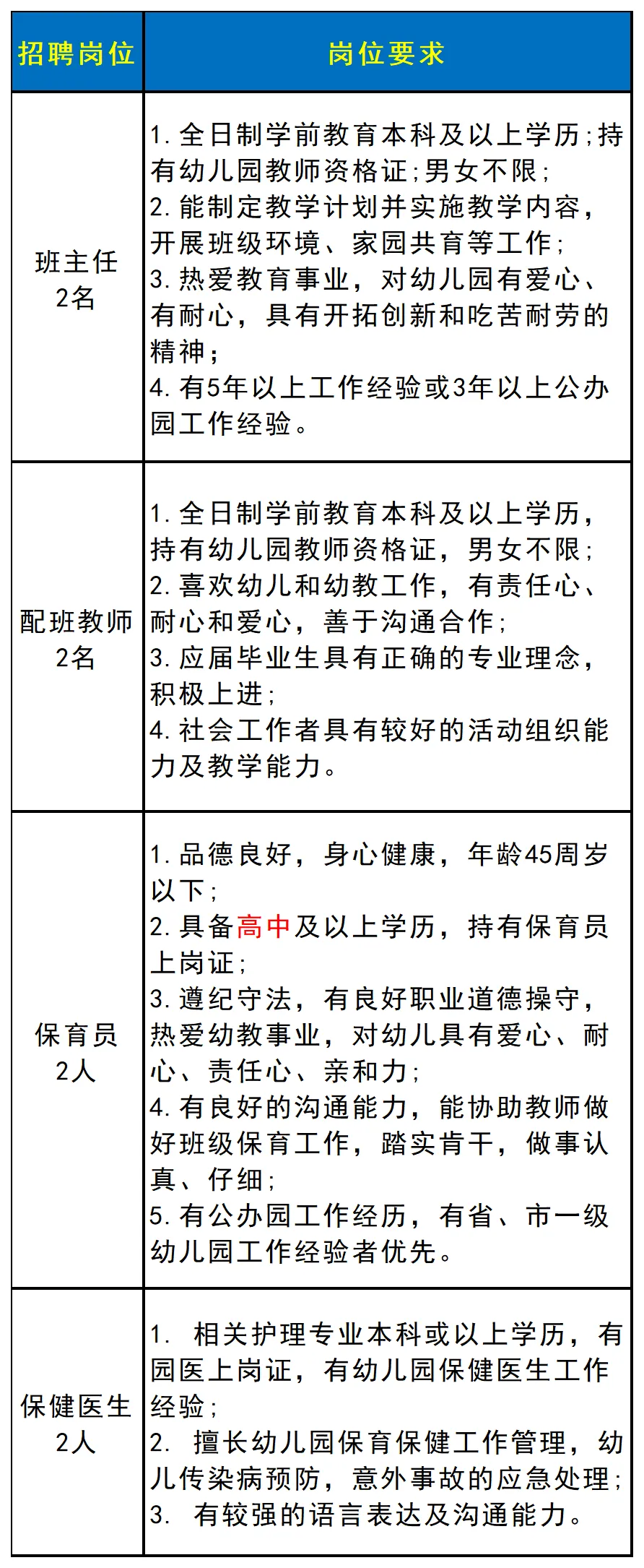 招聘班主任2名、配班教师2名、保育员2人、保健医生2人。一共8人,具体要求如下图所示