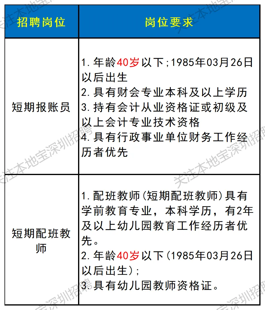 招聘短期报账员1名、短期配班教师1名,人员性质为非在编合同人员,具体要求如下图所示