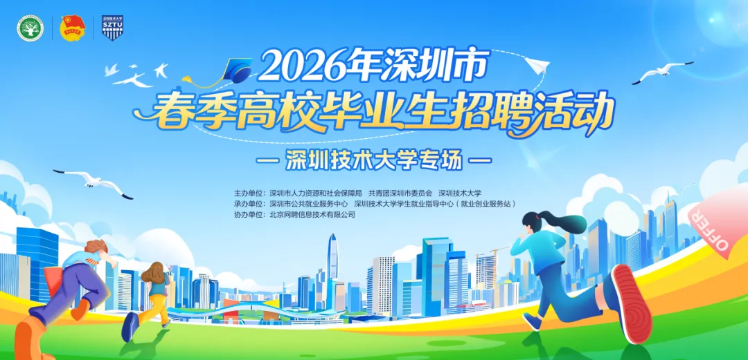 由深圳市人力资源和社会保障局、共青团深圳市委员会、深圳技术大学联合主办的 “2026 年春季高校毕业生招聘活动——深圳技术大学专场”将于4月14日(周二)在深圳技术大学举行,特邀各企业报名参会。