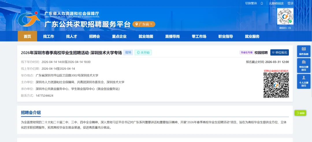 为全面贯彻党的二十大和二十届二中、三中、四中全会精神,深入学习贯彻习近平总书记对广东系列重要讲话、重要指示批示精神,深圳市人力资源和社会保障局开展 “2026年春季高校毕业生招聘活动”,旨在为高校毕业生提供全方位、立体化的求职招聘服务,拓宽高校毕业生就业渠道,促进高质量充分就业。