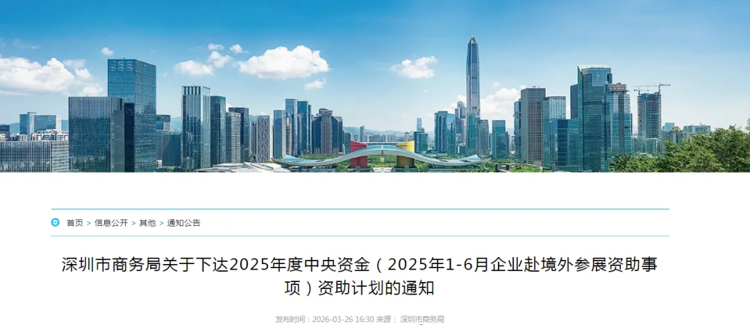 根据《深圳市商务高质量发展专项资金管理办法》(深商务规〔2025〕4号)和《深圳市商务局2025年度中央资金(2025年1-6月企业赴境外参展资助事项)申报指南》等规定,经受理、审核、公示等程序,现下达2025年度中央资金(2025年1-6月企业赴境外参展资助事项)资助计划,本批下达资助金额1923万元。