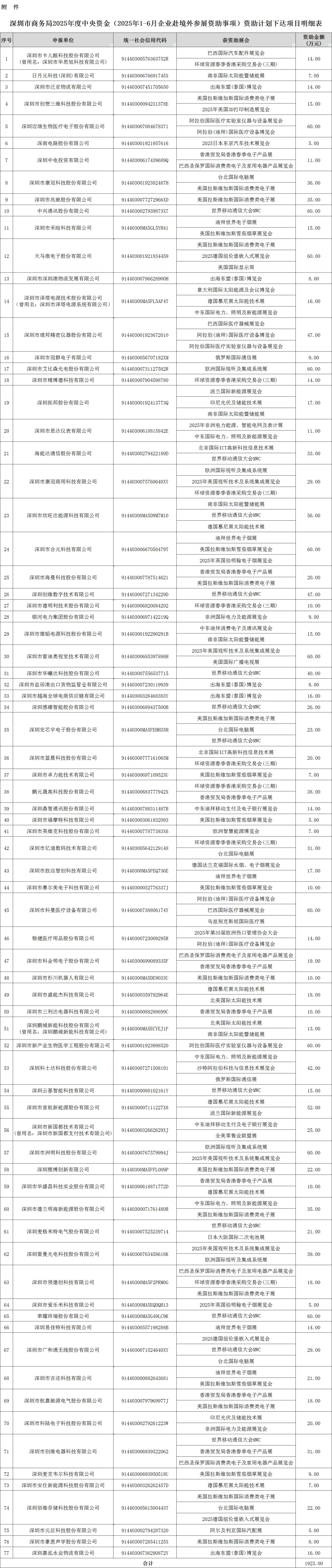 附件:深圳市商务局2025年度中央资金(2025年1-6月企业赴境外参展资助事项)资助计划下达项目明细表