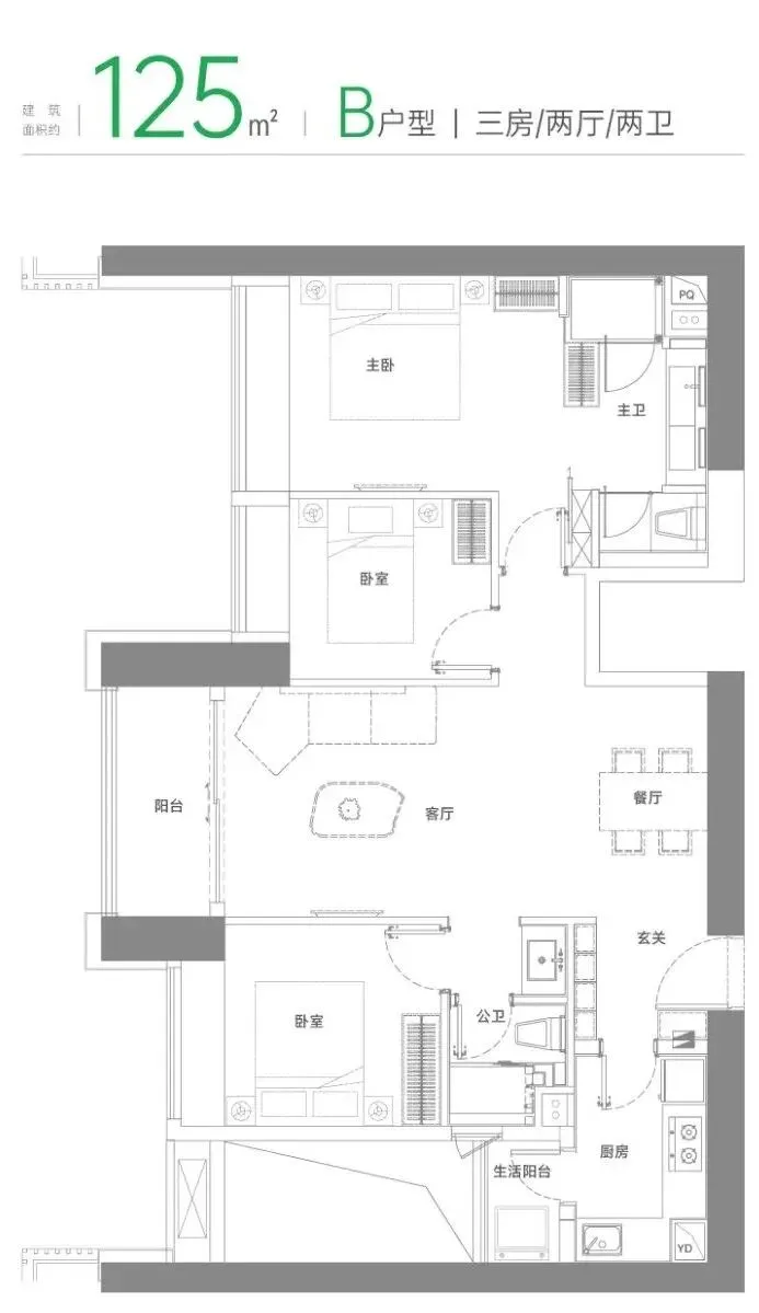 B户型 建面约125㎡三房两厅两卫