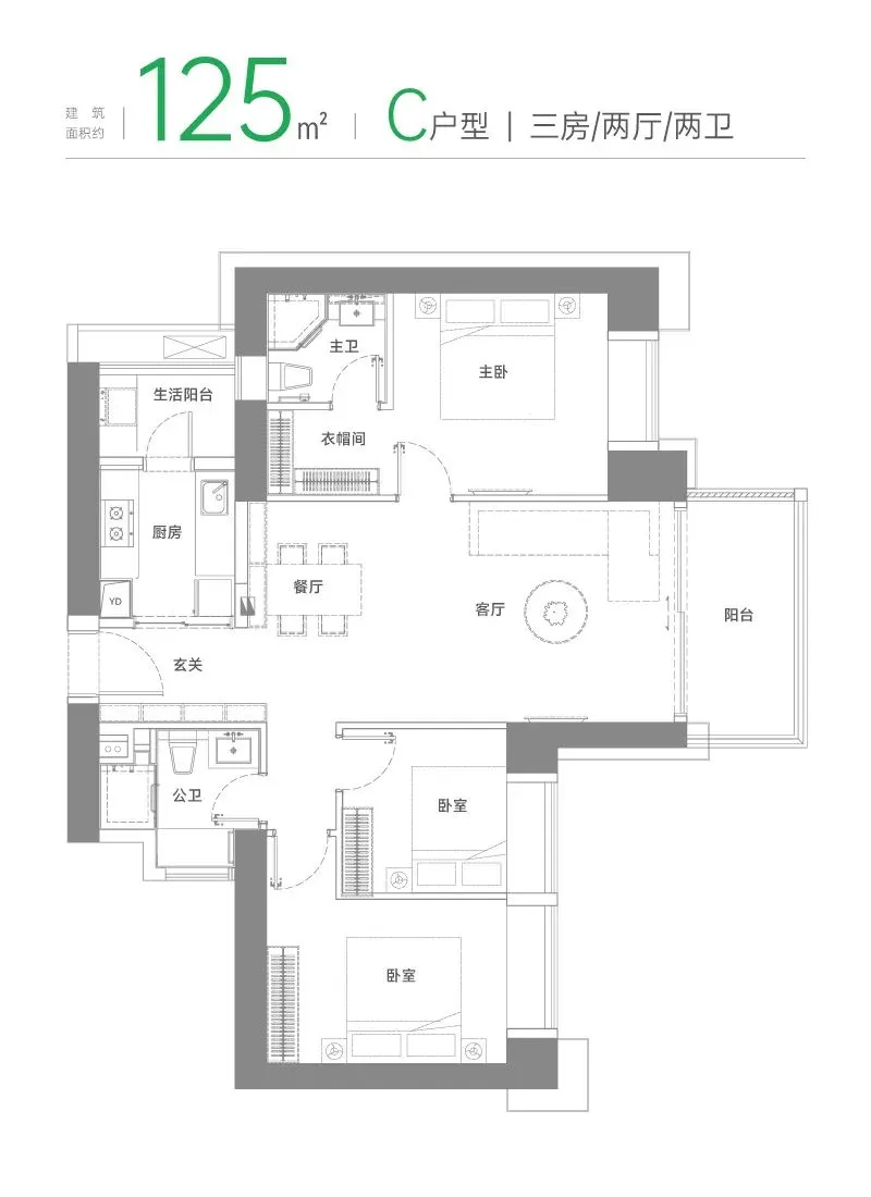 C户型 建面约125 m² 三房两厅两卫