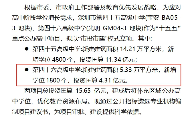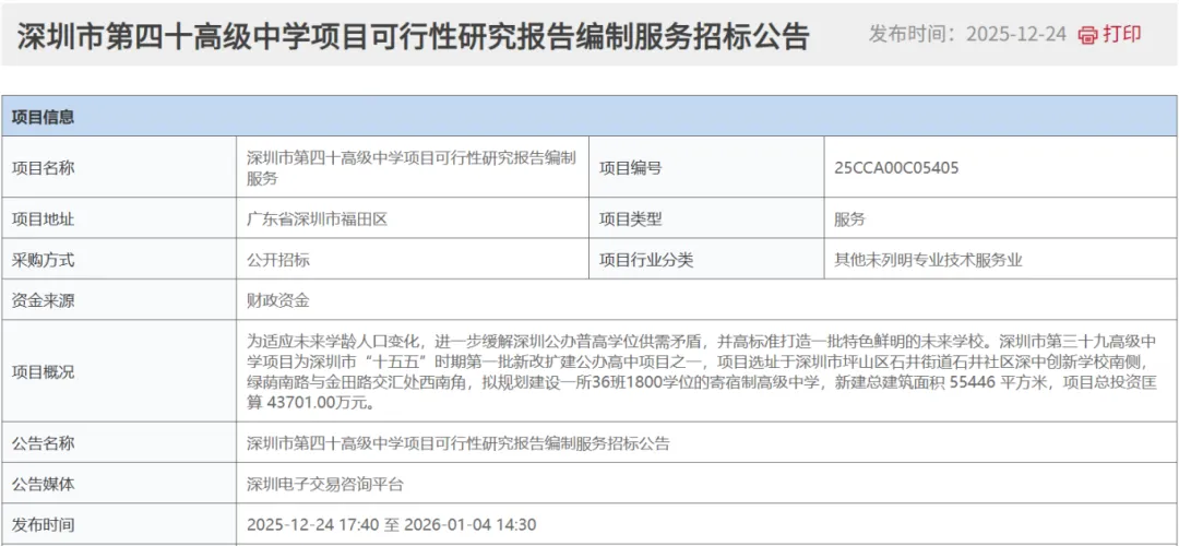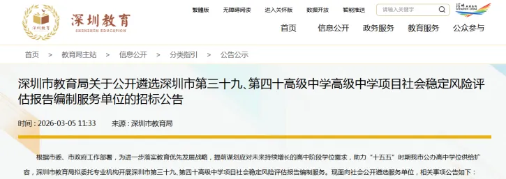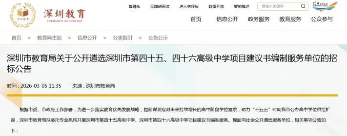 近日,十四届全国人大四次会议上国务院总理李强作政府工作报告中提到增加普通高中学位供给。为响应2026年政府工作报告中教育民生相关核心工作任务,深圳市教育局迅速部署、积极落实,即日发布四所高中学校相关项目招标公告,以优质教育资源建设与服务升级,深化五育并举实施,切实推动教育民生工作走深走实。