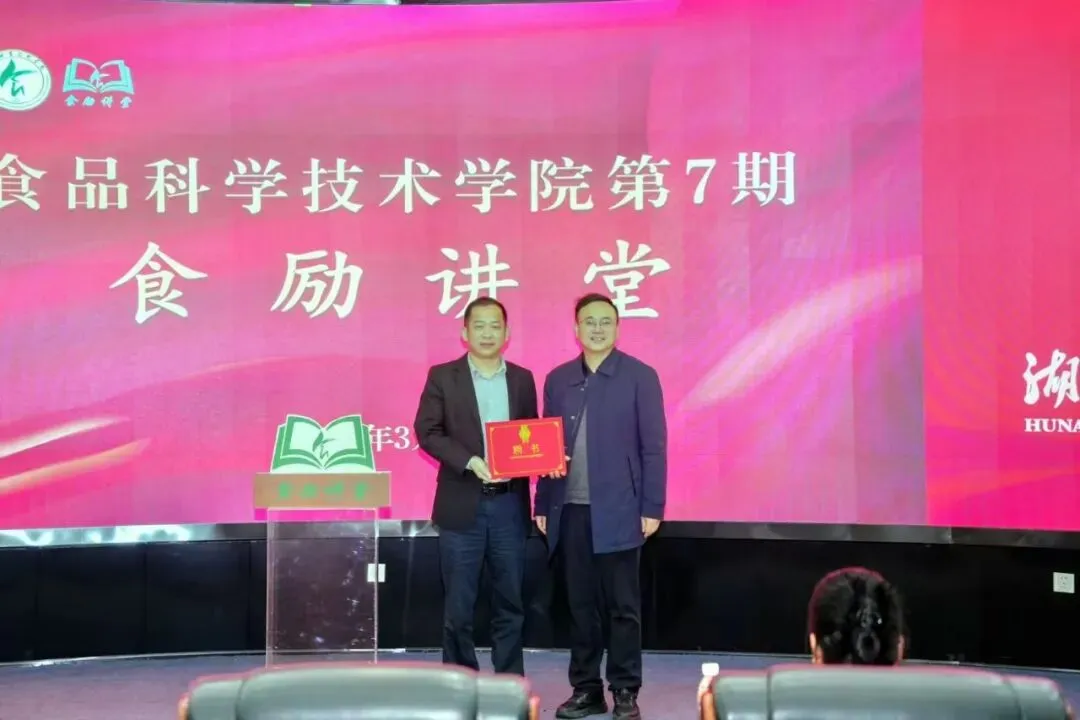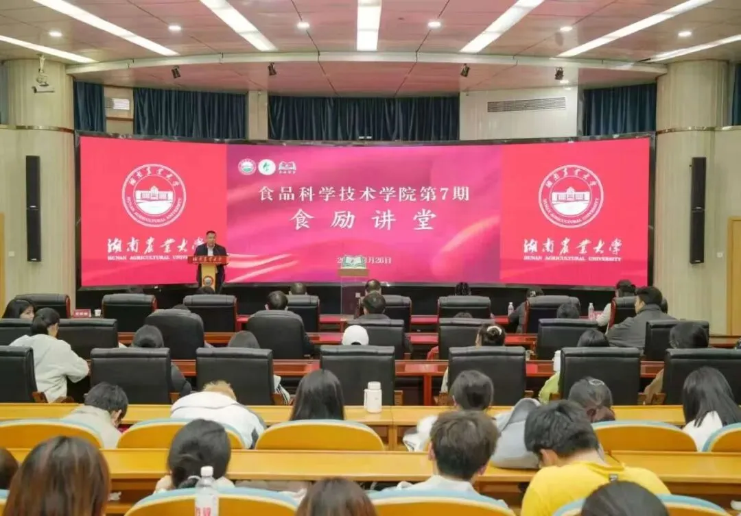 3月26日,湖南农业大学食品科学技术学院第七期“食励讲堂”在生科楼国际会议厅举行。深圳校友会执行会长、食品科学技术学院杰出校友刘荣欣应邀作题为《扎根专业 逐梦湾区 反哺桑梓》的主题报告。校党委委员、副校长吴波及学院师生代表近200人参加活动。活动由食品科学技术学院党委书记刘峻峰主持。