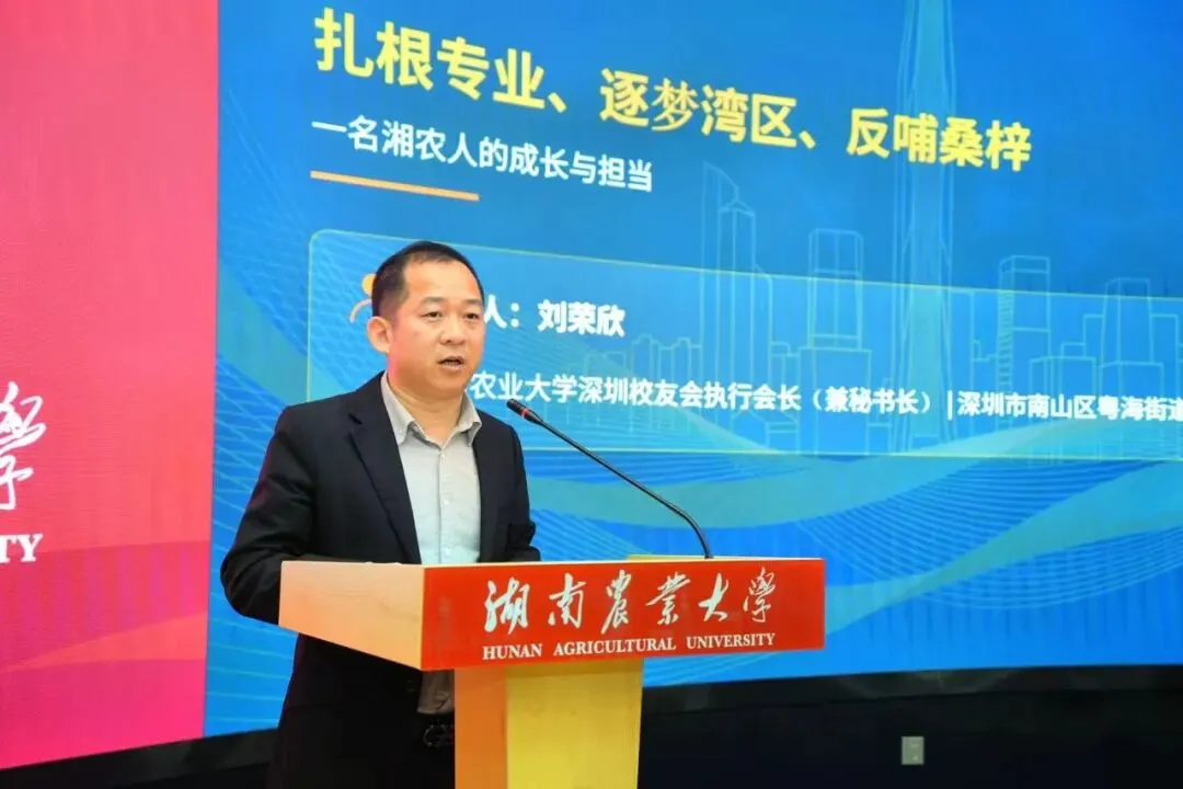 讲座中,刘荣欣结合自身求学与职业发展经历,围绕“扎根专业”“逐梦湾区”“反哺桑梓”三个维度展开分享。他以在母校求学期间的成长故事为切入点,勉励在场学子夯实专业基础、保持学习定力,在食品科学领域深耕细作。随后,他回顾了一位湘农学子从校园走向粤港澳大湾区、从专业深耕到服务社会的成长路径与价值追求。最后,他深情讲述了作为校友反哺母校、服务校友、回馈社会的实践与感悟,号召广大校友与在校学子心怀感恩、薪火相传,将个人发展融入学校建设与国家发展大局。