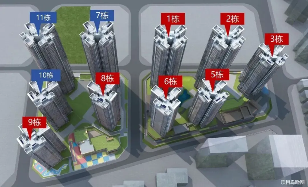 西区:占地2.2万㎡,容积率5.16,包含住宅、商业、幼儿园学校和其它基础配套设施。7栋栋总高47F,3T6户;8栋、9栋、10栋总高32F,2T5户;11栋总高46F,3T6户,2T5户;1栋是幼儿园。