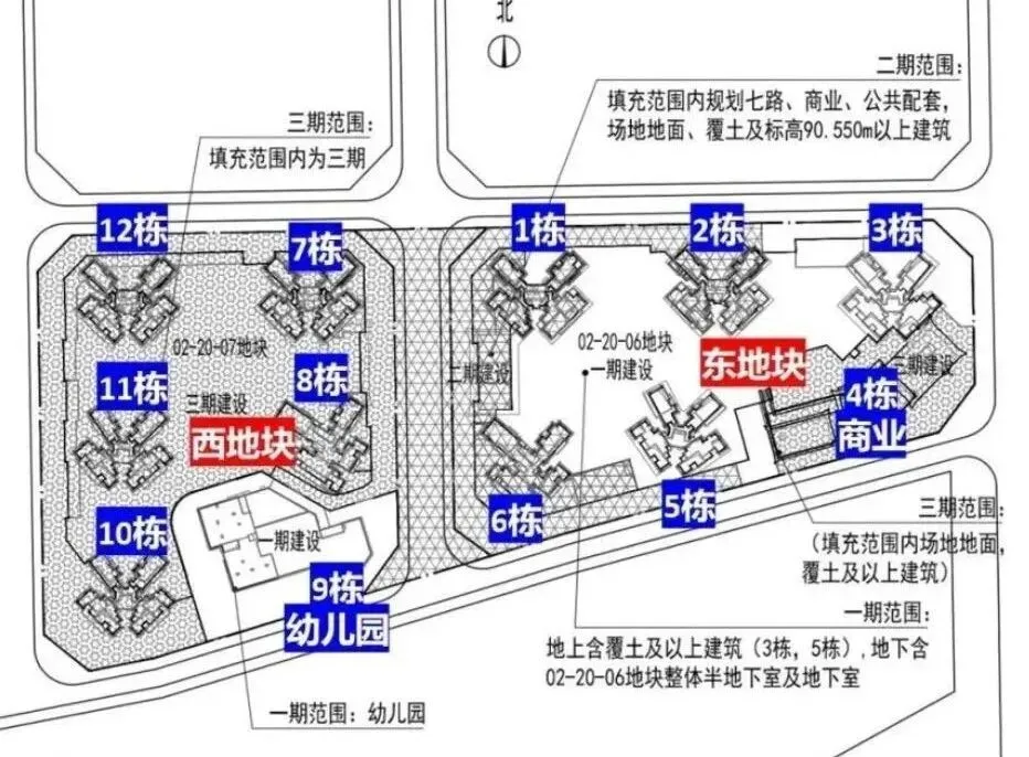 东区:占地约2.1万㎡,容积率5.28,包含住宅、商业、文化活动室、老年人日间照料中心和其他基础配套设施。1栋、2栋总高47F,3T6户;3栋、5栋总高32F,2T6户;6栋总高32F,2T5户;4栋属于商业,总高2层。