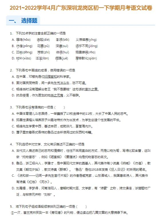 >18套2018-2022学年深圳各区初一下学期月考语文真题及答案解析