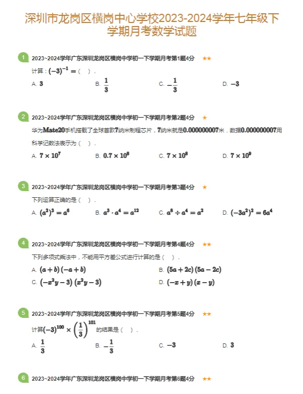 58套2016-2024学年深圳各区初一下学期月考数学真题及答案解析