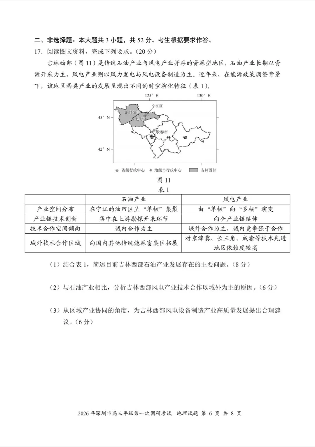 (1)(8分)产业空间分布高度集中,生产过度集聚:(2分)产业结构单一,产业链条简短;(2分)技术创新集中在上游勘探开采环节,加值较低,发展质量难以提高;(2分)技术合作范围窄,以域内为主,技术创新困难。(2分)