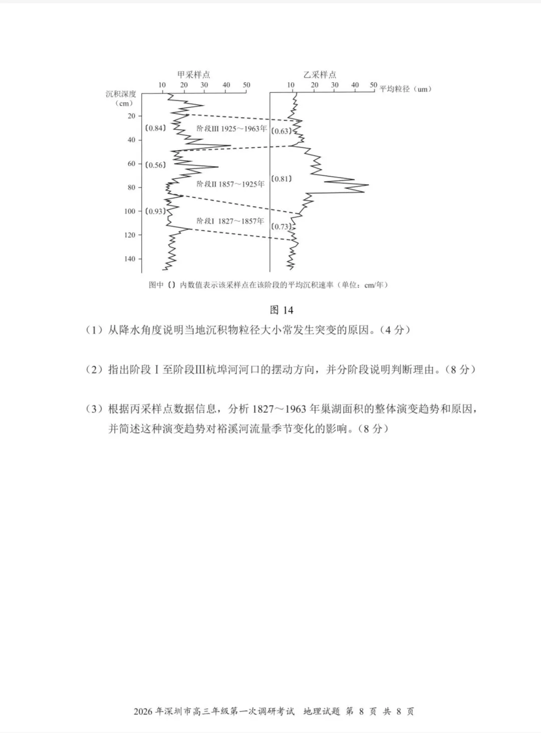 (2)(8分)方向:先向北,再向南。(2分)判断理由:阶段Ⅰ甲采样点沉积速率及粒径都大于乙采样点,说明该时段入湖河口靠近甲采样点;(2分)阶段Ⅱ甲采样点沉积速率及粒径都小于乙采样点,说明该时段入湖河口靠近乙采样点,入湖口向北摆动;(2分)阶段Ⅲ甲采样点沉积速率及粒径又大于乙采样点,说明该时段入湖河口靠近甲采样点,说明入湖口由北向南摆动。(2分)
