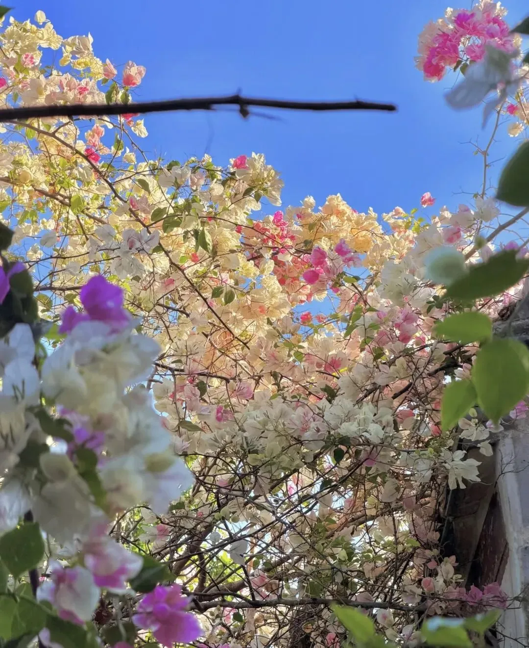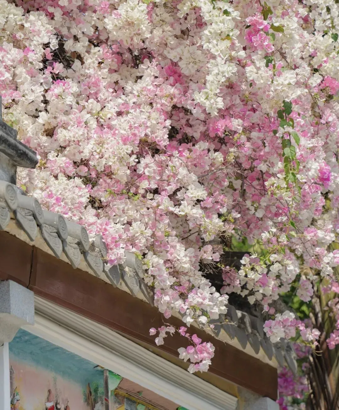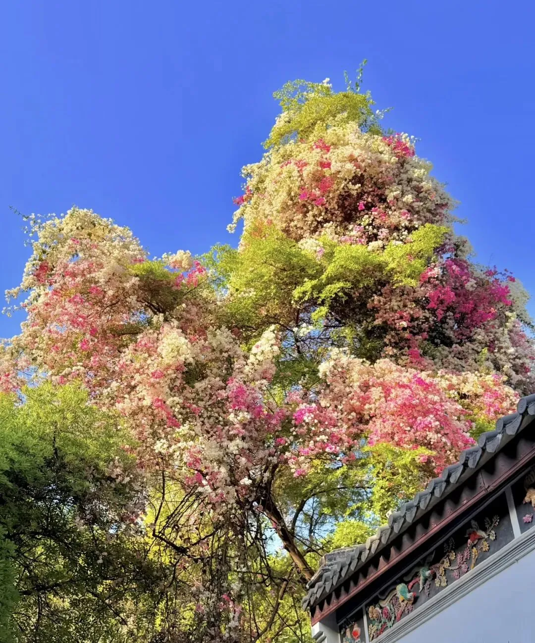 4. 湖北园/古琴台:白墙黛瓦配垂枝三角梅,长焦拍侧脸特写,三角梅落在肩头,国风意境直接拉满。