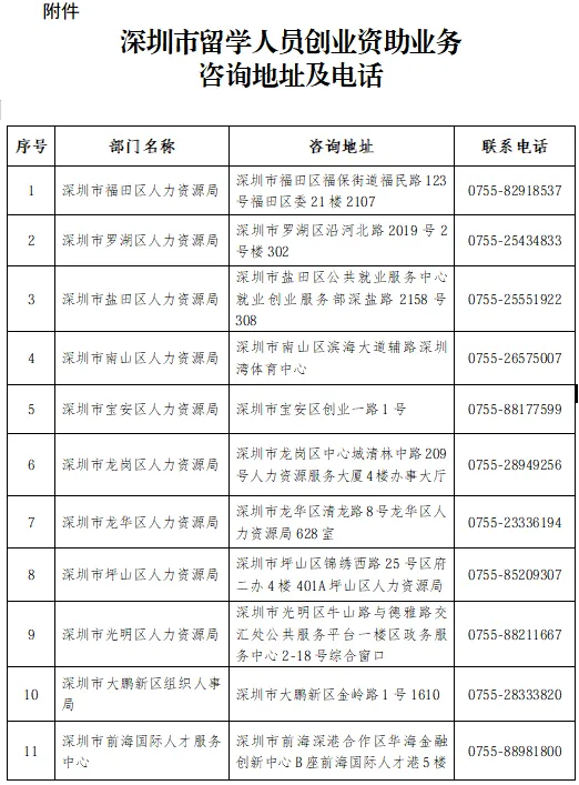 附件:深圳市留学人员创业补贴业务咨询地址及电话