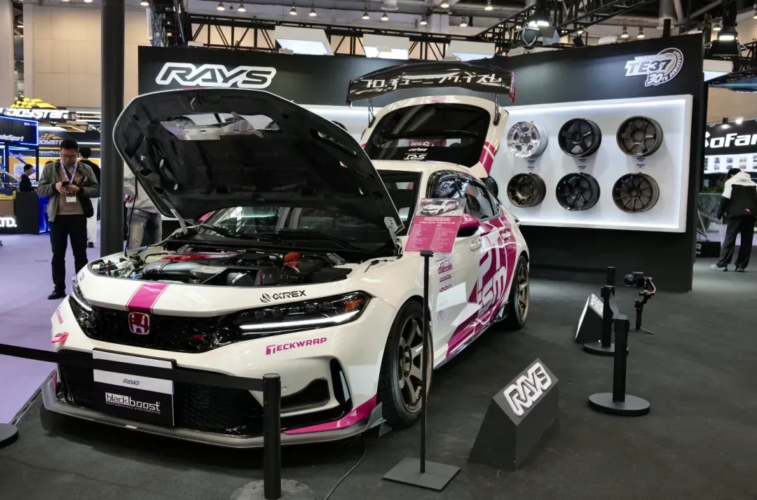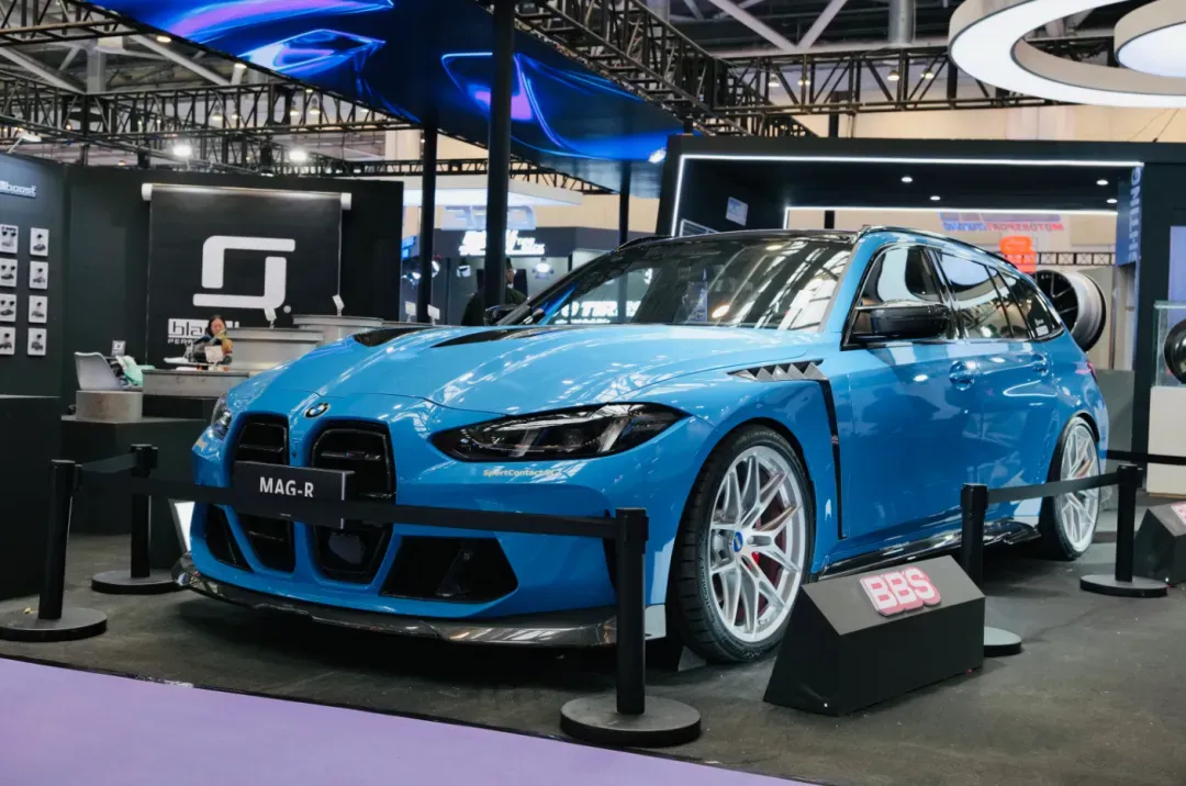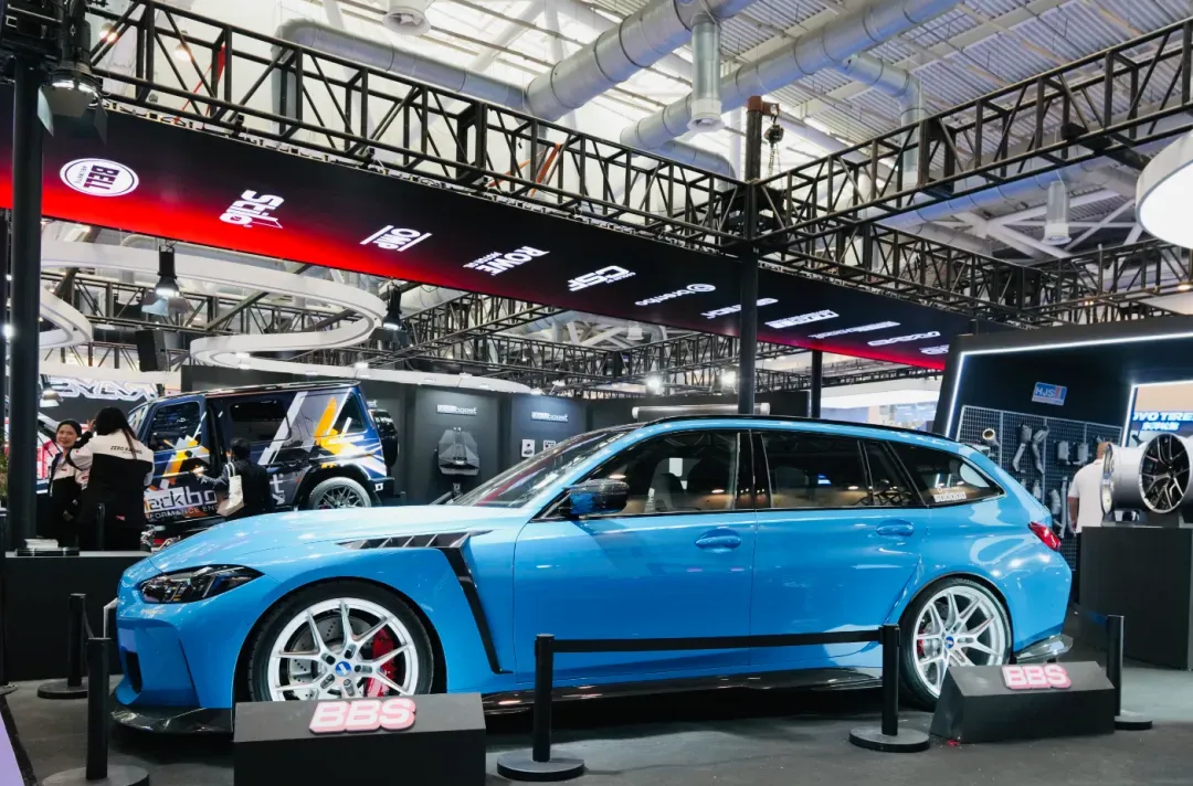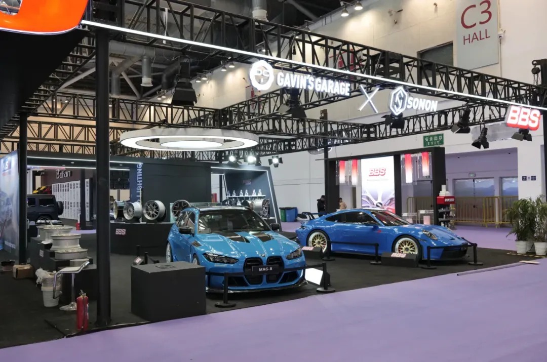 多台展车集成轮毂、进气、碳纤等品牌升级件,现场呈现完整改装方案: