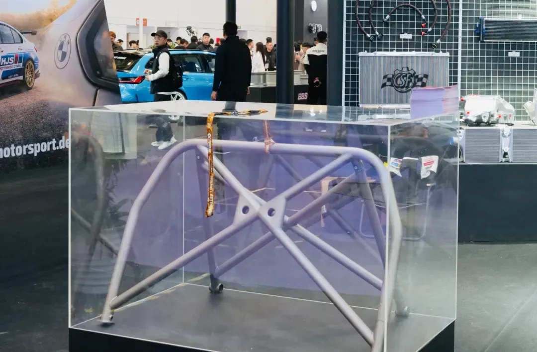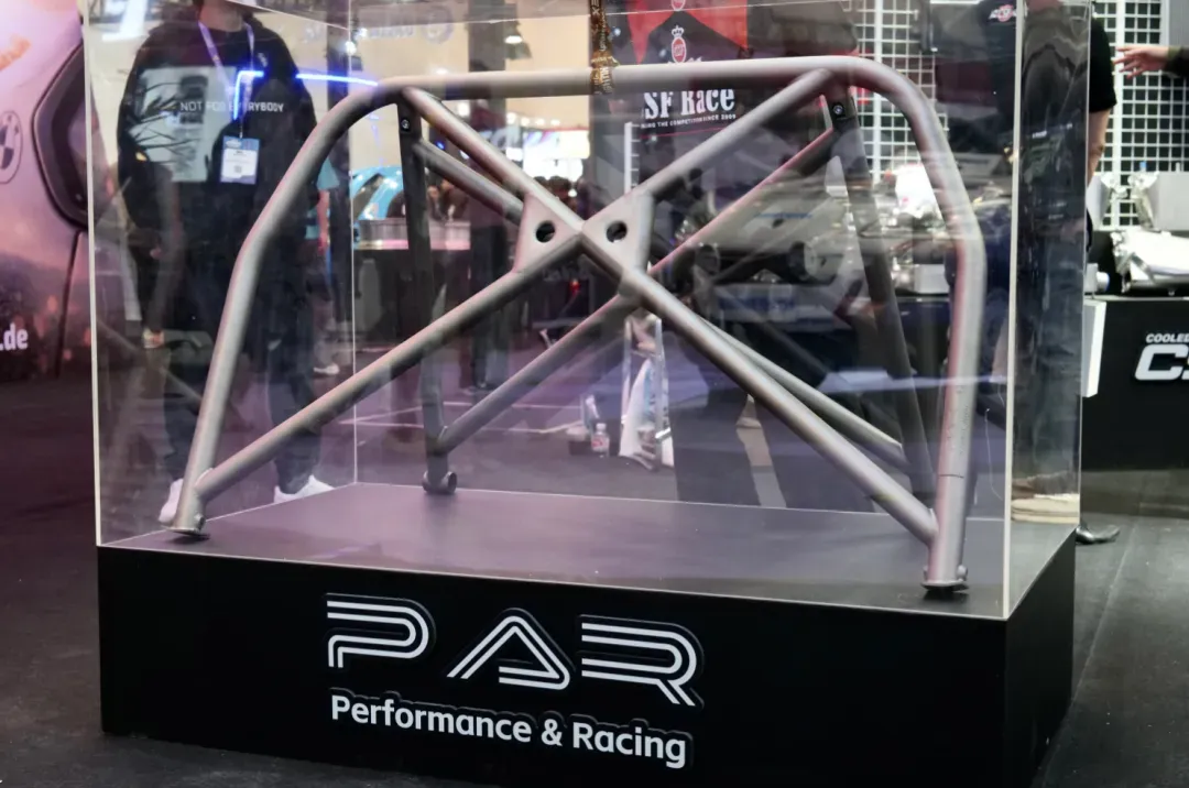 展示了一款由PAR推出的钛合金材质半笼式防滚架,现场可通过提拉方式,直观感受钛合金材质的轻量化特性。在尽量避免加重车身的同时,为赛道爱好者提供更好的保护与车身强化。