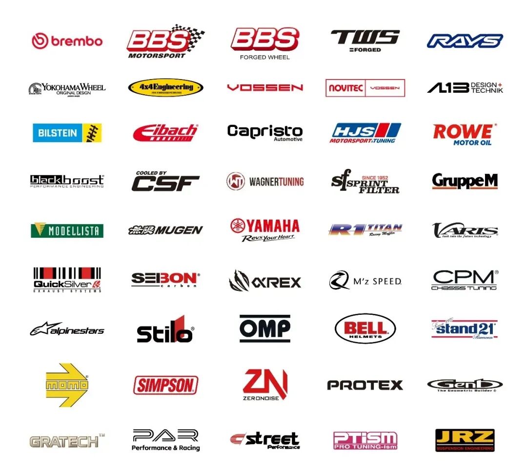 零创主营的世界知名改装品牌:YAMAHA、YOKOHAMA Wheel、Brembo、BBS、TWS、RAYS、VOSSEN、Capristo、HJS、SF、WT、GruppeM、HJS、ROWE、JRZ、VARIS、SEIBON、CPM、AL13、BELL、A星、Stilo等。