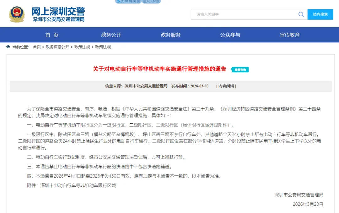 深圳市公安局交通管理局发布《关于对电动自行车等非机动车实施通行管理措施的通告》,设立一级限行区、二级限行区、三级限行区,限制电动自行车等非机动车通行。通告自2026年4月1日起至2026年9月30日有效。