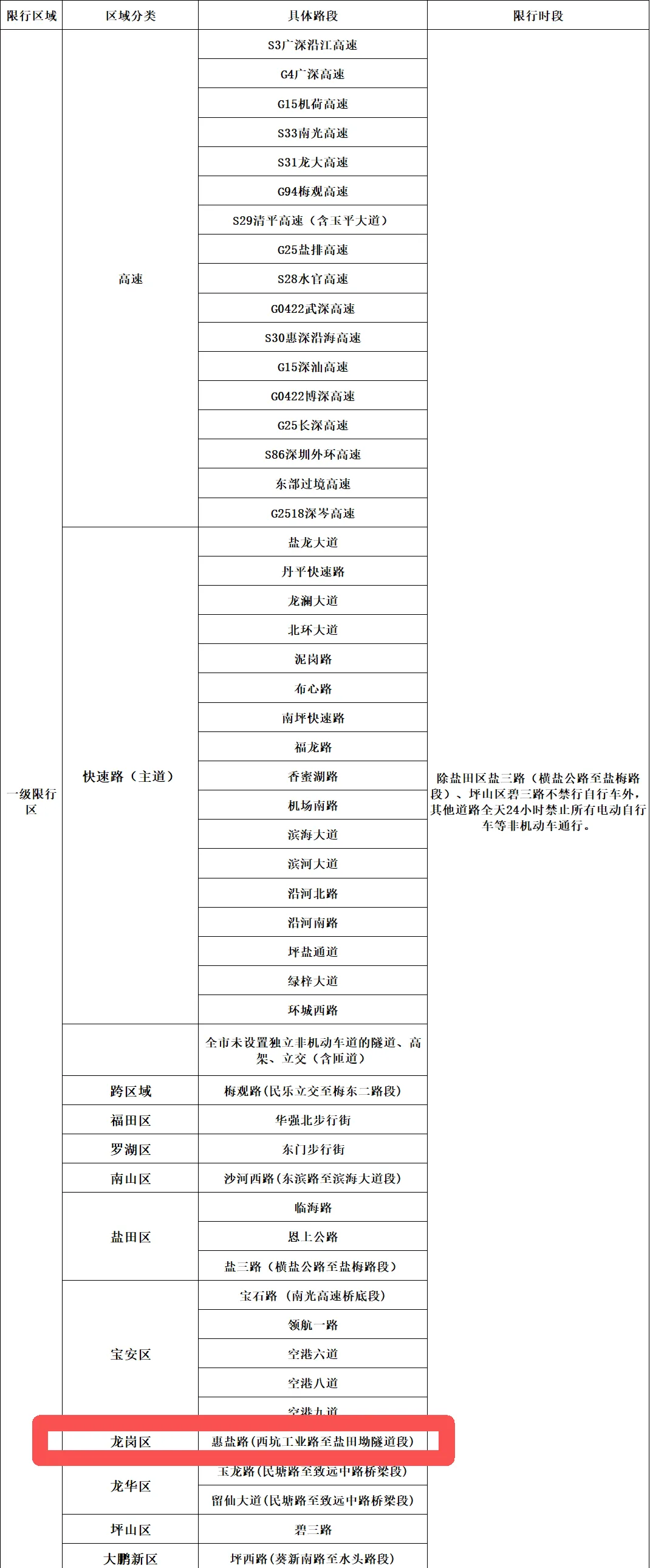 1️⃣一级限行区中,除盐田区盐三路(横盐公路至盐梅路段)、坪山区碧三路不禁行自行车外,其他道路全天24小时禁止所有电动自行车等非机动车通行。
