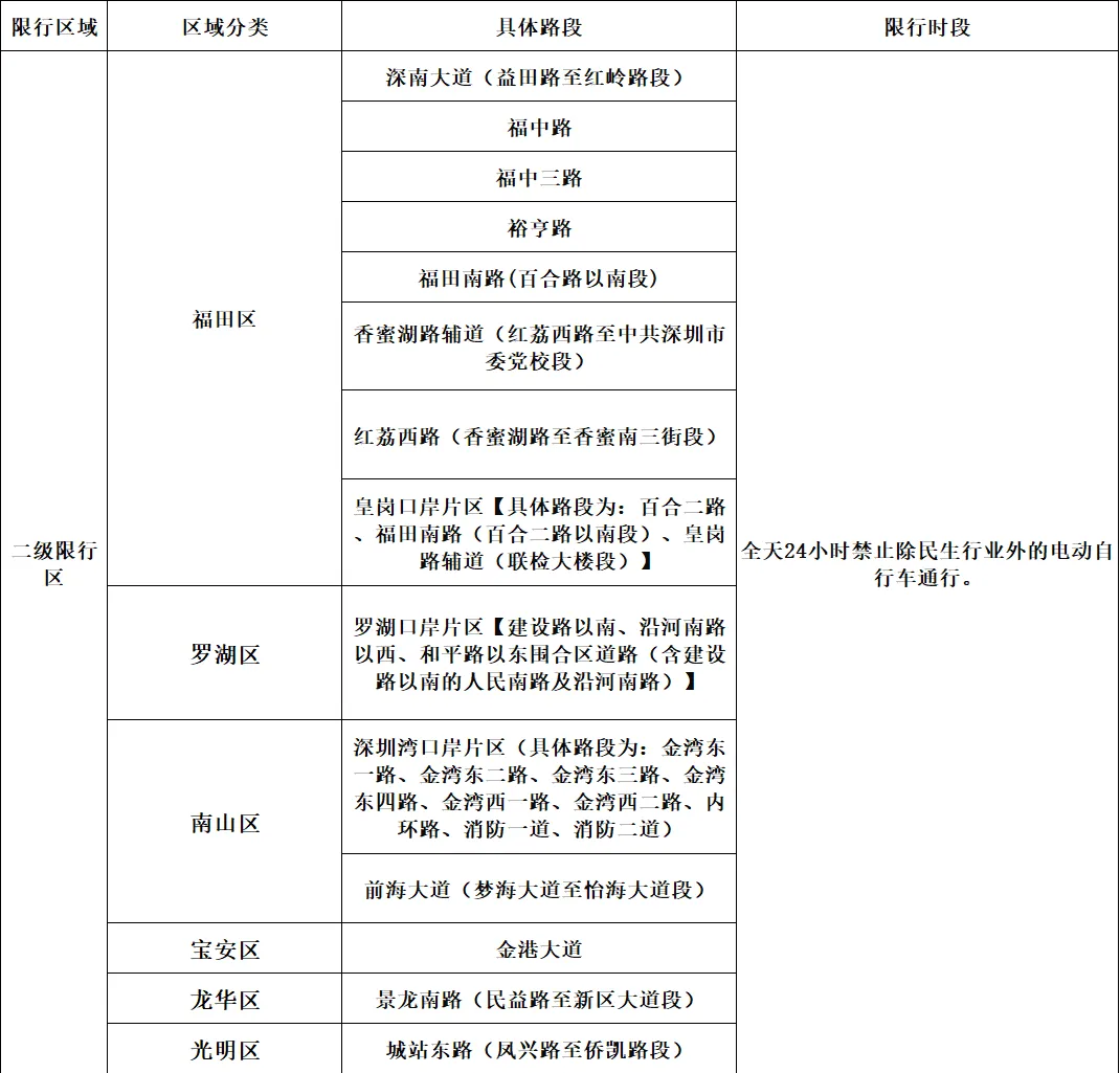 规定:除盐田区盐三路(横盐公路至盐梅路段)、坪山区碧三路不禁行自行车外,其他道路全天24小时禁止所有电动自行车等非机动车通行。
