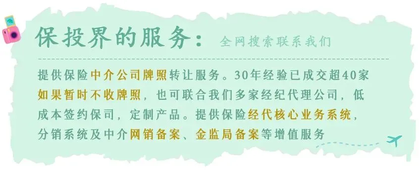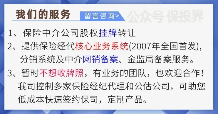 ◩关注公众号【保投界】中中保险咨询有限公司深耕保险行业30年,致力为其引进耐心资本,专注赋能行业迅速腾飞,潜心提升行业管理水平!核心人员从事保险中介股权交易已超九年。已成交40多家保险中介公司牌照!暂时不想收牌照的,也可以联合我们多家经纪代理公司,低成本签约保司,定制产品。同进提供保险经代核心业务系统,分销系统及中介网销备案、金监局备案等增值服务,关注保投界,收听更多。