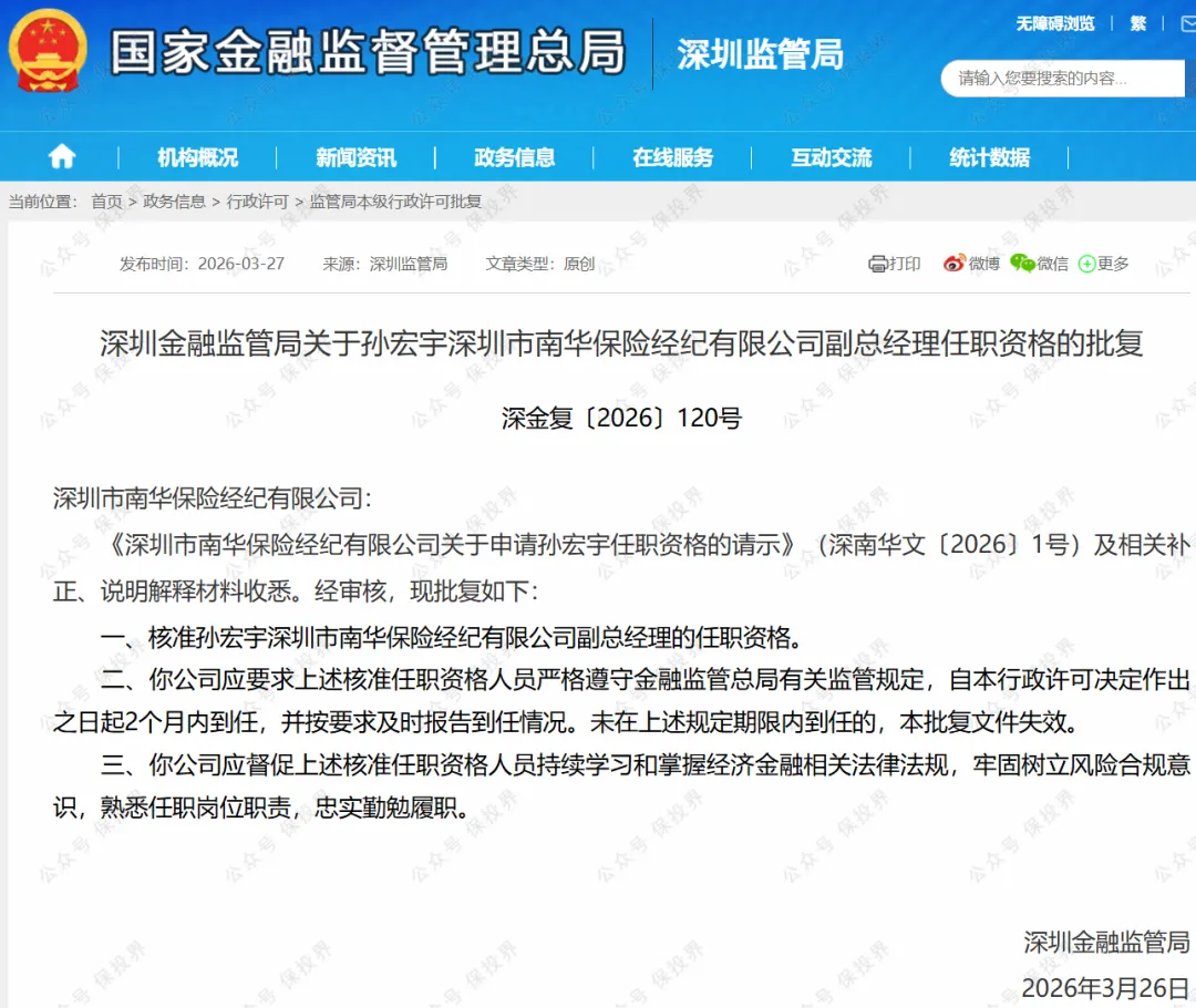 2026年3月27号,深圳市南华保险经纪有限公司副总经理的任职资格由孙宏宇担任,这任职资格已得到深圳金融监管局正式批复(深金复〔2026〕120号)。这一次人事上有举动,是在公司刚完成扭亏为盈的关键时候,那信号很清晰。关于南华保险经纪