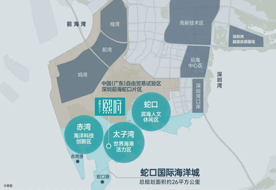 再看区域,这也是深铁熙府最硬的底气——位于南山太子湾片区!熟悉深圳的朋友都知道,太子湾是深圳西部黄金海岸线的核心,左边是前海自贸区,右边是蛇口滨海人文区,周边全是豪宅聚集地,配套直接共享,完全不用将就。